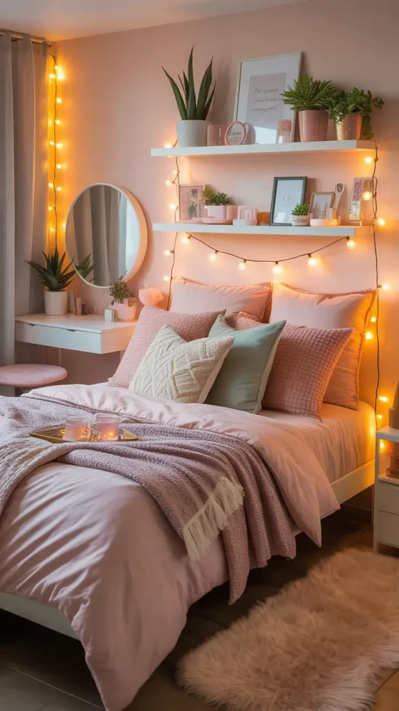 I tend to include plush bedding, rough throw pillows, fairy nebul and low-strand LED lights, and small paintings on the wall. Storage baskets, decorative shelving and mini vanities are very popular additions since they assist in maintaining the place neat and they appear attractive. The room appears to be warm and welcoming with a comfortable chair and a soft rug.