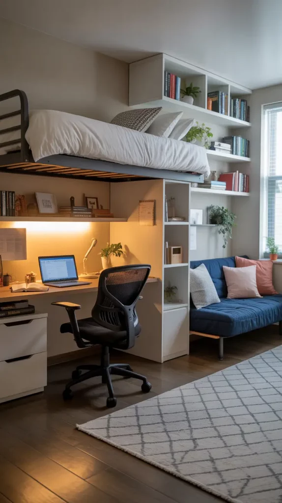 Personally, it has been found that lofted areas are most effective when there is a thought-out lighting plan under the bed. To prevent dark spots, a number of interior specialists suggest the use of LED strip lighting or clippable lamps to illuminate the low part of the space. I have also discovered that this makes studying a far more welcoming place to work.
