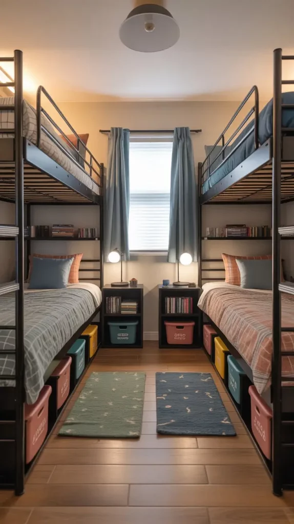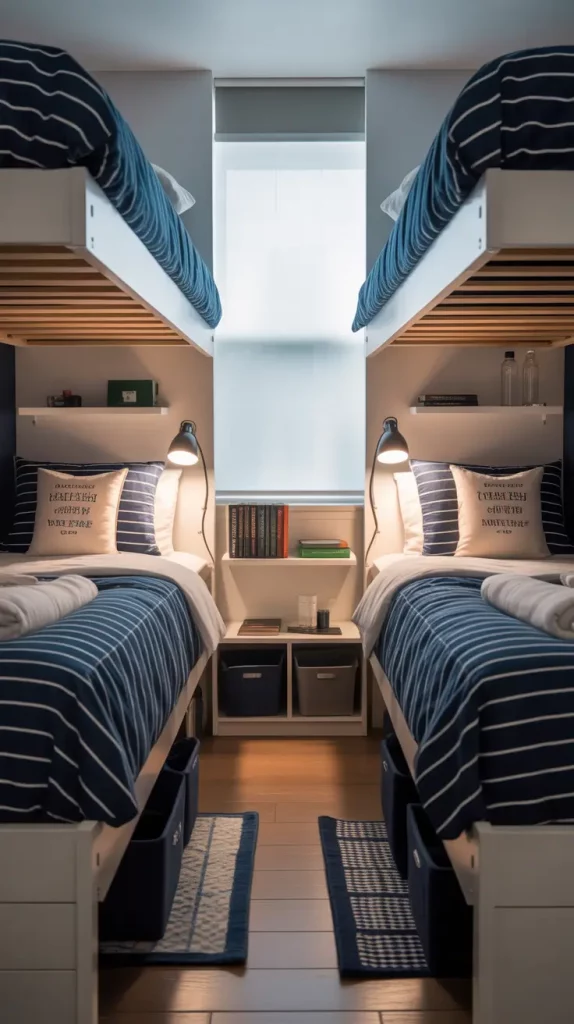 I usually organize bed sets, bedside tables, portable reading lamps and small carpets on each side of the room. Bins used in the storage of personal items under each bunk assist in ensuring that the personal items are well organized. Providing that the bunk bed has built-in ladder or some kind of shelving, I will adorn these features with low-light lamps or other minor organizational tools to make it convenient.