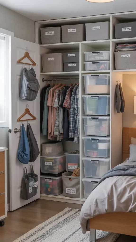 I tend to add over-the-bed shelves, rackable drawers, rolling carts, closet hacks and door mounted hook. The obvious bins make sure that there is no loss of items whereas the fabric baskets are to provide warmth and texture. Shoe racks, desk boxes, and mini storage boxes allow grouping of the products and minimizing clutter.