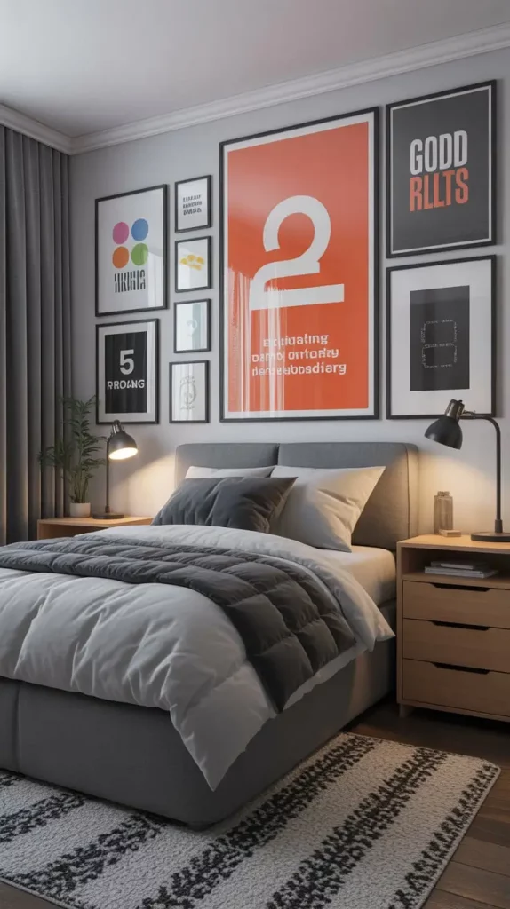 I tend to combine various forms of art: a gallery wall above the bed, a big print behind the desk and a removable mural on one side of the room. The thin borders of the frames make the room look modern and clean, and colored prints are used to provide the sense of warmth and the sense of life. The personal notes, photos, and creative arrangements can be made by including cork boards or magnetic boards.
