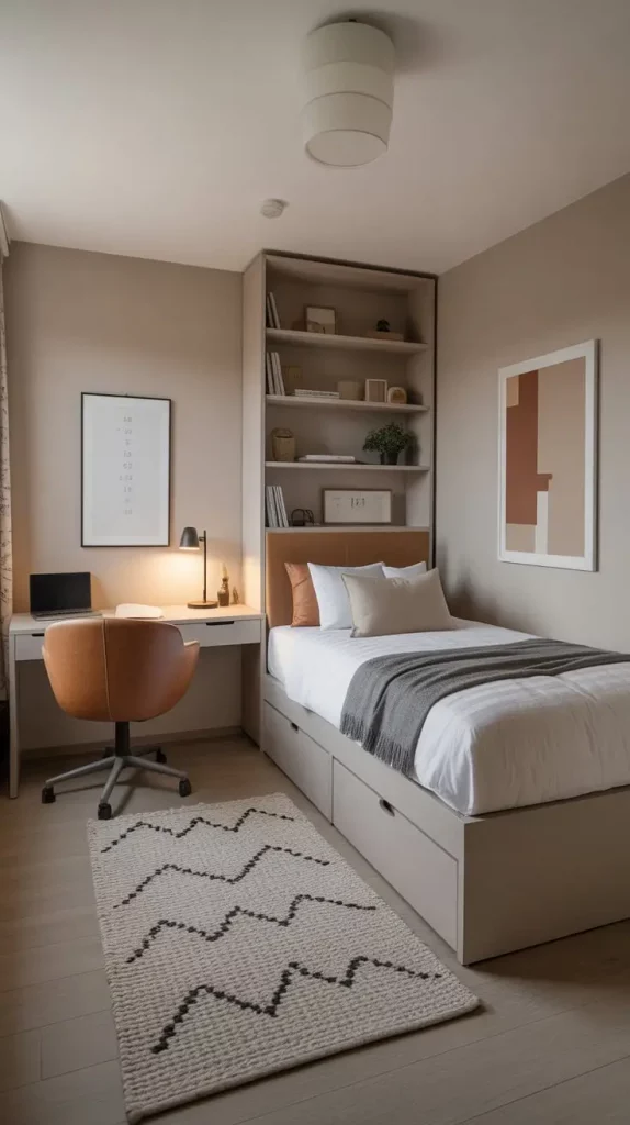 In designing a dorm room to be used by men, I give attention to functionalities, comfort, and their mature style that does not involve clutters. Lots of male students in 2026 are inclined to neutral colors, dark wood, and lack of accessories. My basic layout is always a simple and organized structure that facilitates studying socializing and relaxation.