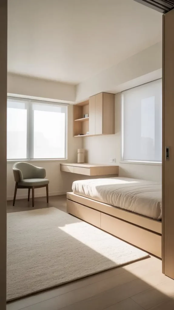 My attention is given to minimalist furniture: small desk, bed-built, and one accent chair. The bedding, crisp curtains, and natural textures are neutral and make the environment serene. A small rug, one or two decorative pillows and a very well selected wall art make the look complete without cluttering the room.