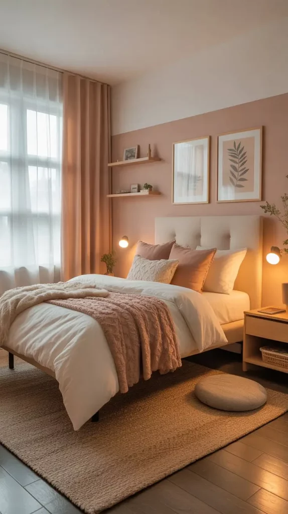 I normally deal with blush-colored bedding, rose-coloured pillows, cream rugs, plush woven throws, and lamps with gold accents. To store, I prefer to use white shelves or light-wood storage racks so that the room does not look too monochromatic. A picture frame with soft pink colors can be used to unite the decor, and pillows with texture can be used to give the room an appealing look.