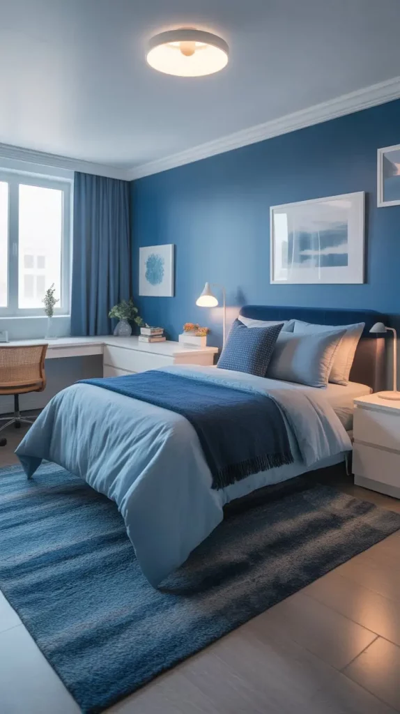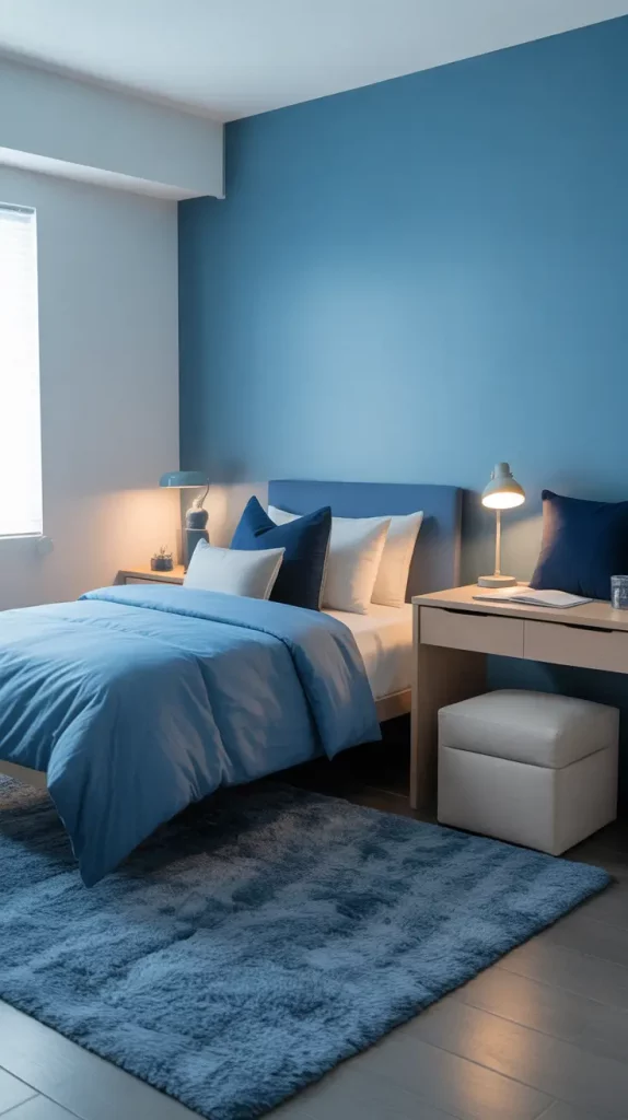 To give the space a sense of place, I tend to incorporate blue bedding, blue-themed throw pillows and a soft blue rug. To make the palette complete, it is better to add blue desk organizers, prints on walls, or curtains. The blues are not overpowering with a few white or light wood details.