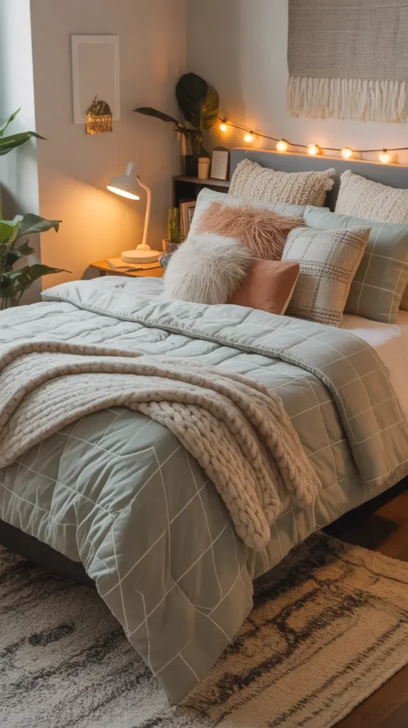 I prefer reversible comforters, plush blankets and decorative pillows in matching colors. Microfiber or soft cotton sheets are the best as they are breathable and easily maintained. I would also suggest to have a mattress topper to make it more comfortable because dorm mattresses are often of low quality.