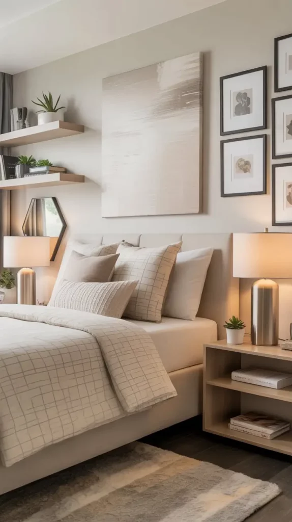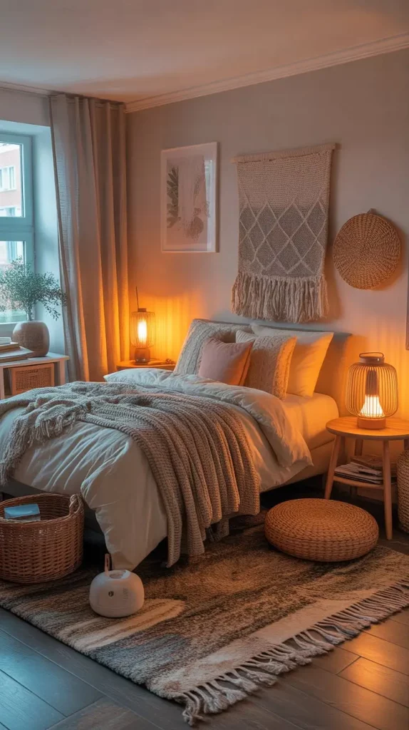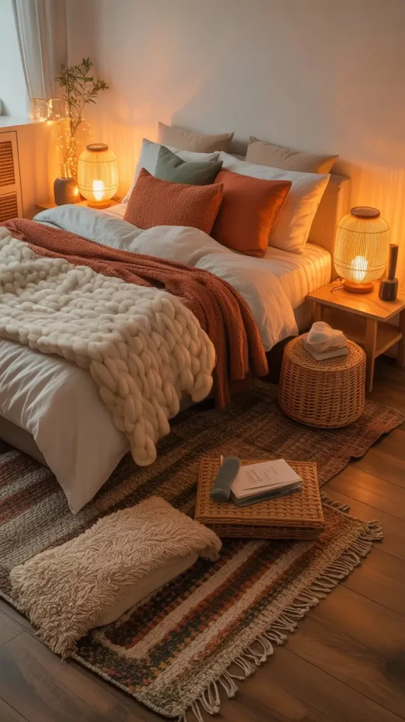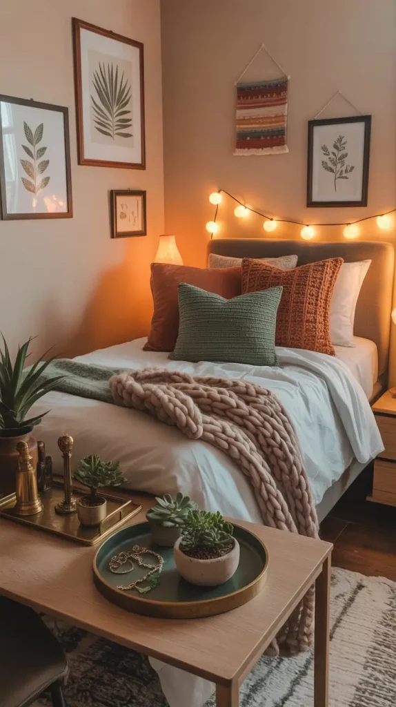 In order to create this appearance, I use textured cushions, knit blankets, upholstered headboards, and soft microfiber rugs, along with ambient lighting, like lantern lamps or LED curtains. These objects bring out color and coziness without making the room obsolete. Side tables made of wood or woven baskets also assist in forming the ambience of lived-in coziness without crammed into the small space.