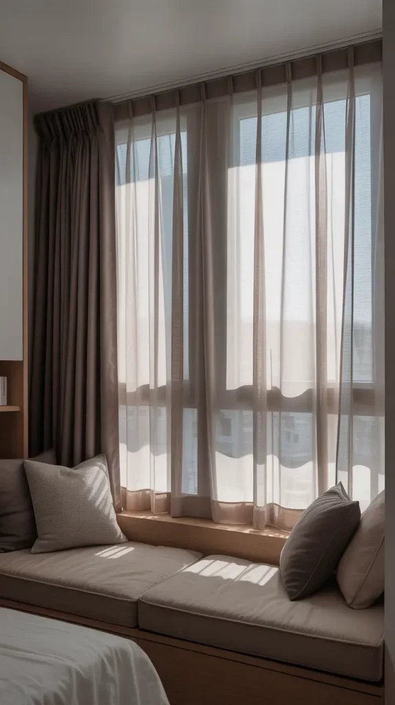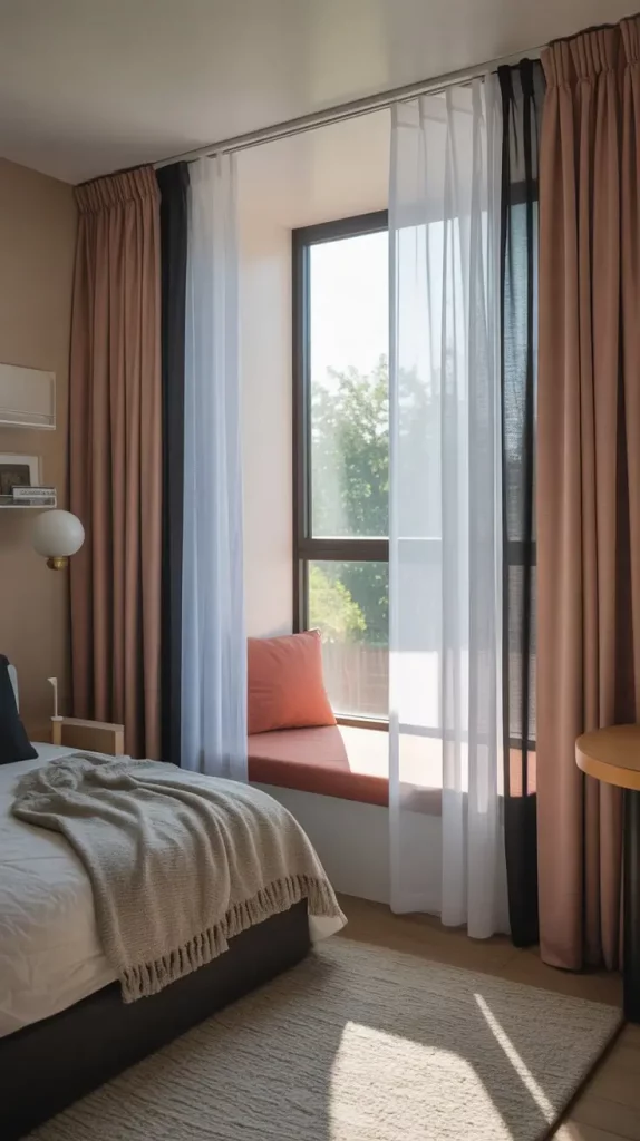 I would like to use neutral curtains with blackout curtains because they are soft and functional. There is a black or gold slim curtain rod that provides modern touch. Where possible, I also add window stickers or frosting material in the dorm to add the additional privacy but still allow natural light to enter. There is a little window-side plant or seat which makes the place even higher.