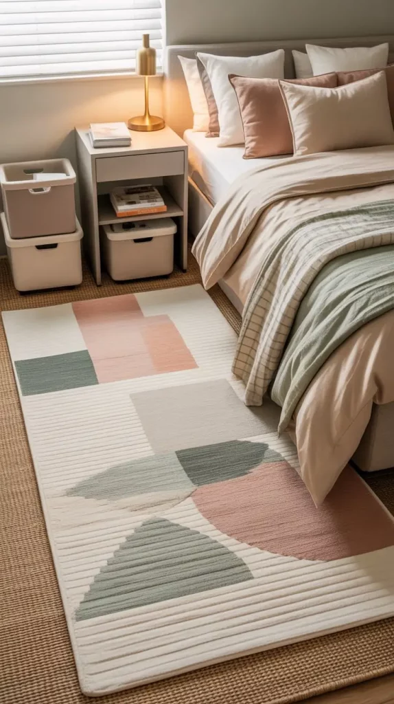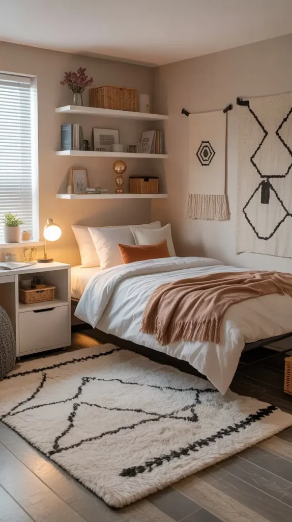 During the choice of a rug, I consider materials that are durable and at the same time soft. The woven rugs with low pile, faux wool, or washable are perfect in student rooms and I usually prefer neutral colors with minor designs to keep it clean and contemporary. Another aspect that I find useful is the layering of a lesser rug beside the bed to make a comfortable landing point. Every rug style contributes a role, a bigger rug can be used to create an anchor in the room, and the rest of the accents can be used to create a different pattern of the same dorm design and make your room look more styled. Muted warm rugs, geometric patterns, or light textures are also in line with the 2026 design trends that focus on clean lines and comfort.