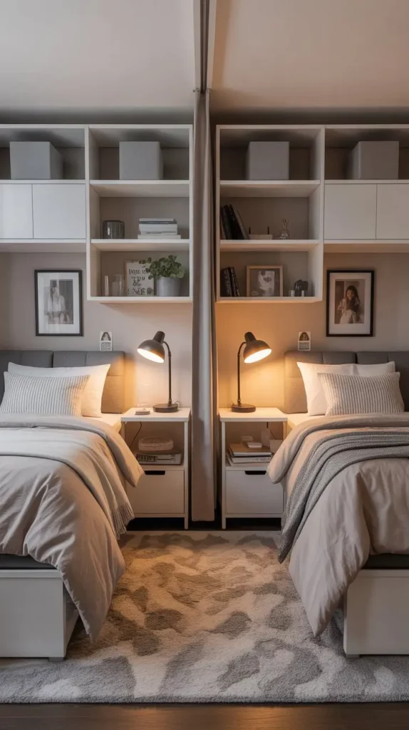 Luckily, in the case of the furniture and the decor, I would typically suggest using a somewhat unified color scheme soft neutral, dusty pastel, or muted earth tones are excellent to create a rather minimalistic and modern atmosphere. It must include functional decor: bedside shelves must be equal, storage cubes too, LED task lamps, and ottomans with two purposes will bring out the symmetry and functionality. I also use a few personalized accessories like corkboard or framed photographs at every desk so that each student gets a personalized area and he/she feels at home. Sleeping and studying areas can be visually separated using soft room divider or a curtain without causing overcrowding of the room.