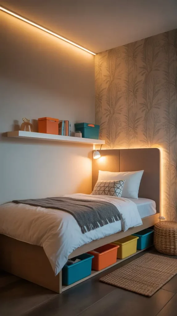 In case of furniture and decals, I give more priority to multifunctional ones and cheaper substitutes. Clip-on reading lights, wall shelves that can be stuck on the wall, and small organizers can be used to save the space at a low cost. Peel-and-stick walls and fabric headboards, which are cheaply made with foam panels, or homemade wall prints are also other options I would recommend to make the room look different. Storage bins, small throw rugs, and colored throw pillows are cost-effective elements that give the room a personality yet the company does not have to make significant investments. Such a basic solution as changing the lighting to warm LED can do a lot in changing the atmosphere of the room.