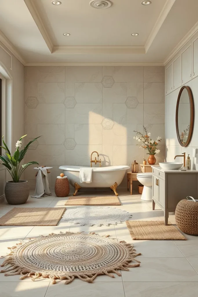 I favour materials presented in natural stone finishes or lightly enfleshed ceramic. Consider a matte beige subway tile, a pebble-toned mosaic rendered in restrained earth colours, or muted hex tiles in subtly variegated gray. These formats, safely non-distracting, coexist comfortably across walls, shower enclosures, and paved floors, conferring cohesion upon the entire room.