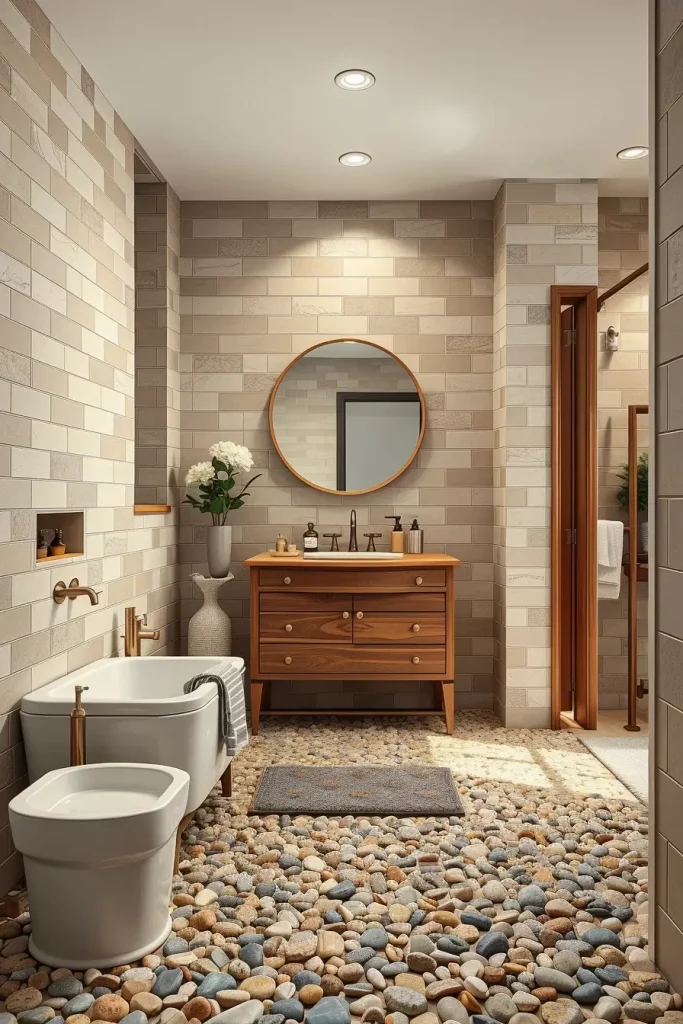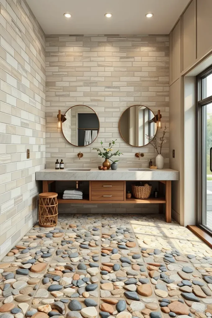 I frequently specify pebble tiles for shower floors, accent walls, or tub surrounds. Their organic appearance and softly textured surface yield an in-situ foot massage, making them practical and visually appealing. I’ve also seen a pebble tray or a few coordinated bath accessories instantly upgrade a more minimalist space.