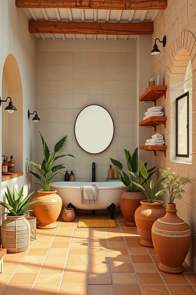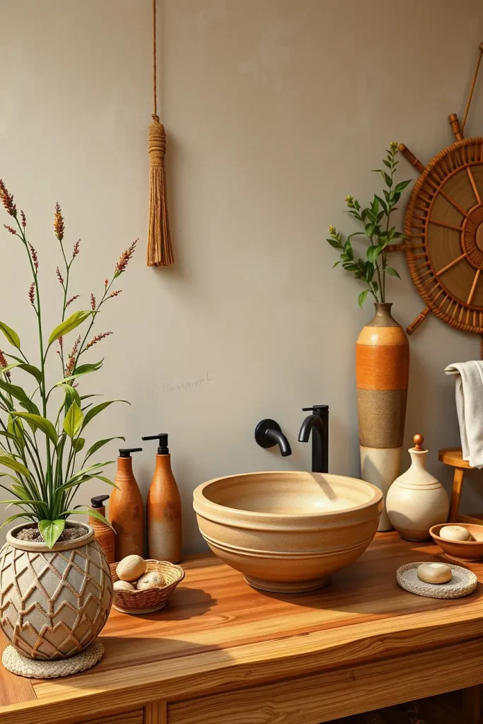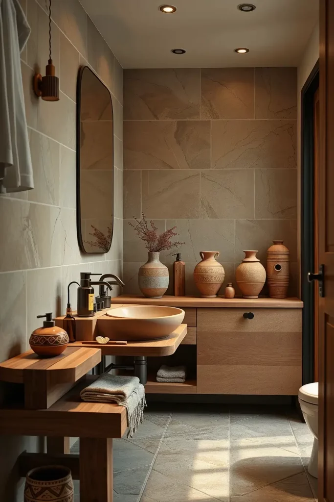 Handmade pottery consistently enriches an earthy bathroom with an authenticity that no other material can match. Whether fashioned as a vessel for water, a rest for soap, or a modest vase, pottery brings a visceral, almost communitarian quality. Each contour and blemished glaze quietly asserts humanity, elevating the room from merely functional to quietly habitable.
