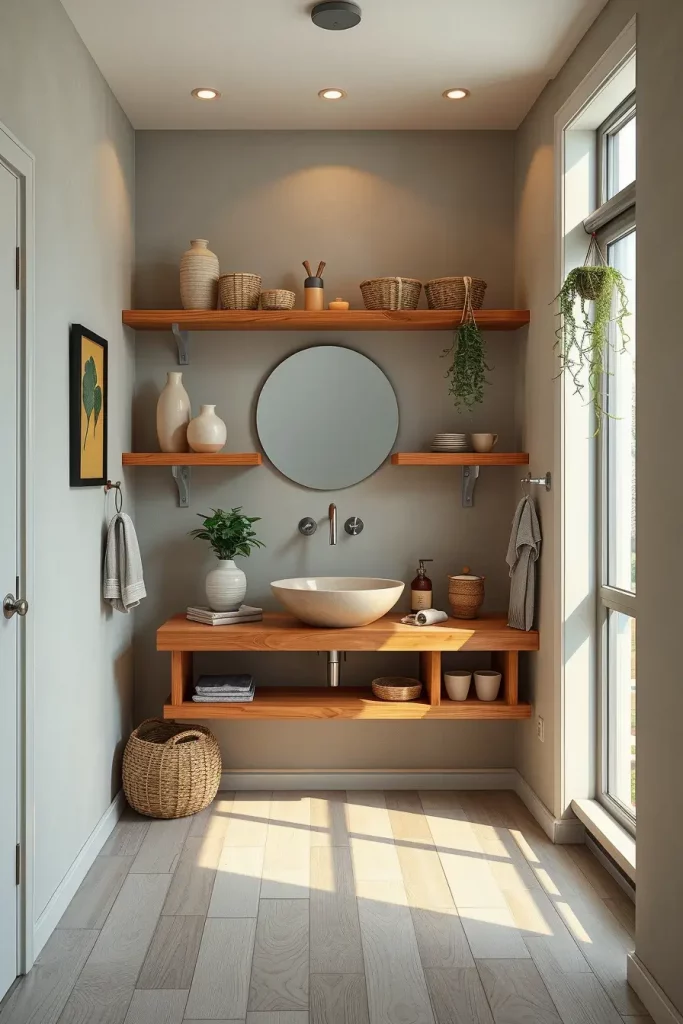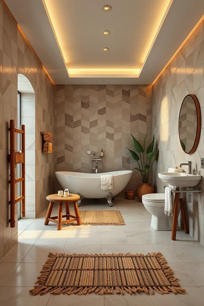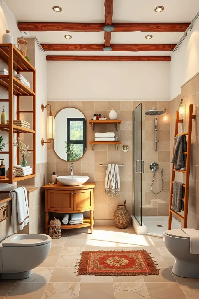 I frequently introduce reclaimed timber vanities, suspended wooden shelves, and compact stools to cultivate layered tactile comfort and enduring utility. A slender bamboo ladder, modest as it appears, softens a bathroom’s clinical edges and introduces quiet warmth. By selecting moisture-resistant hardwoods—teak and cedar top my list—I balance visual appeal with lasting resilience.