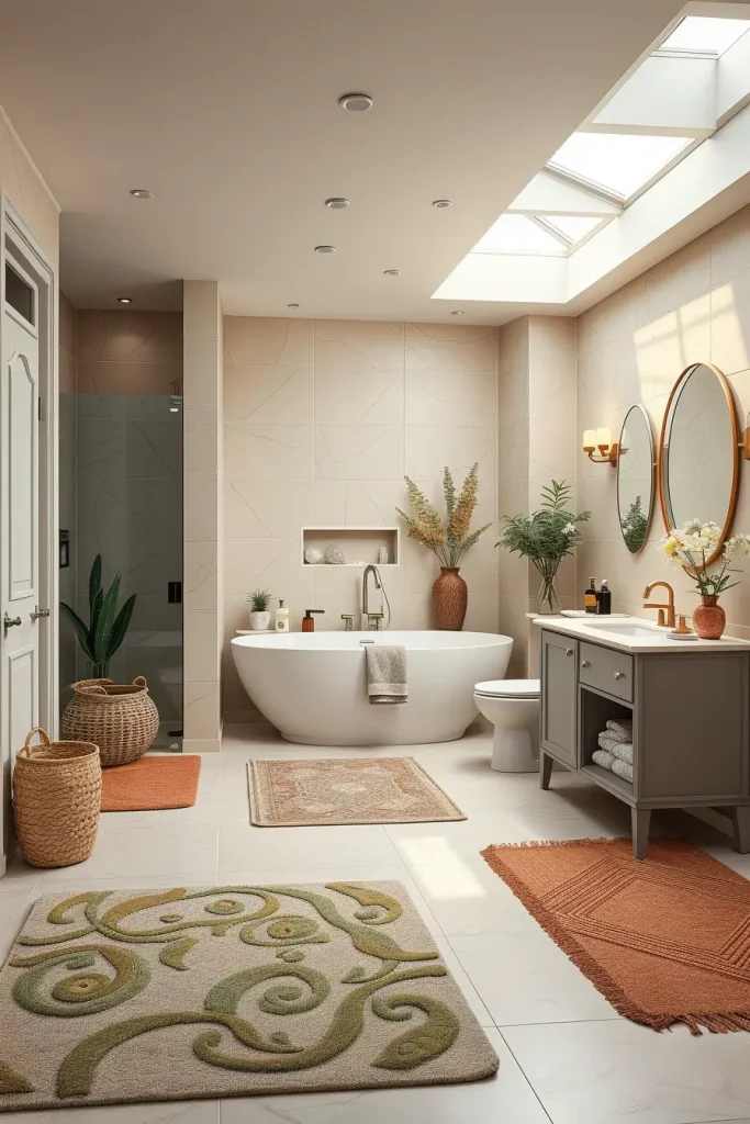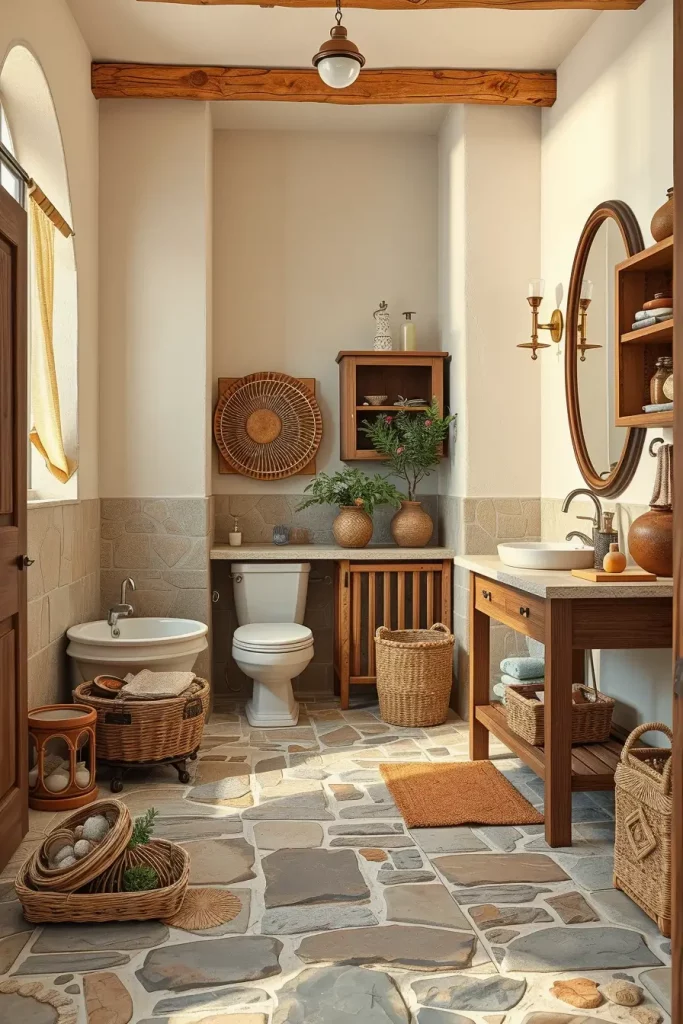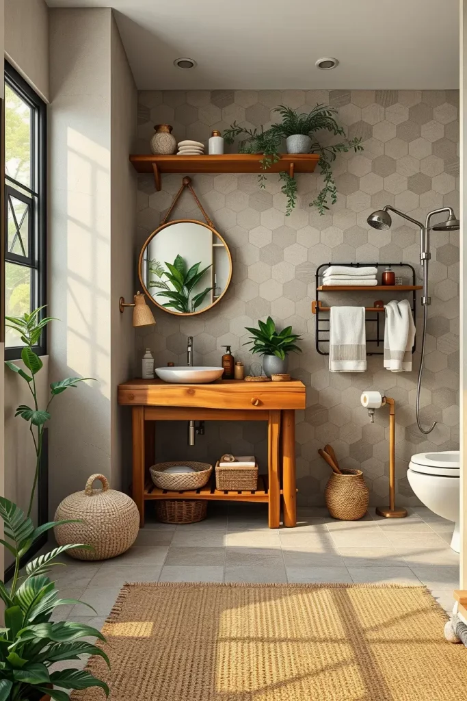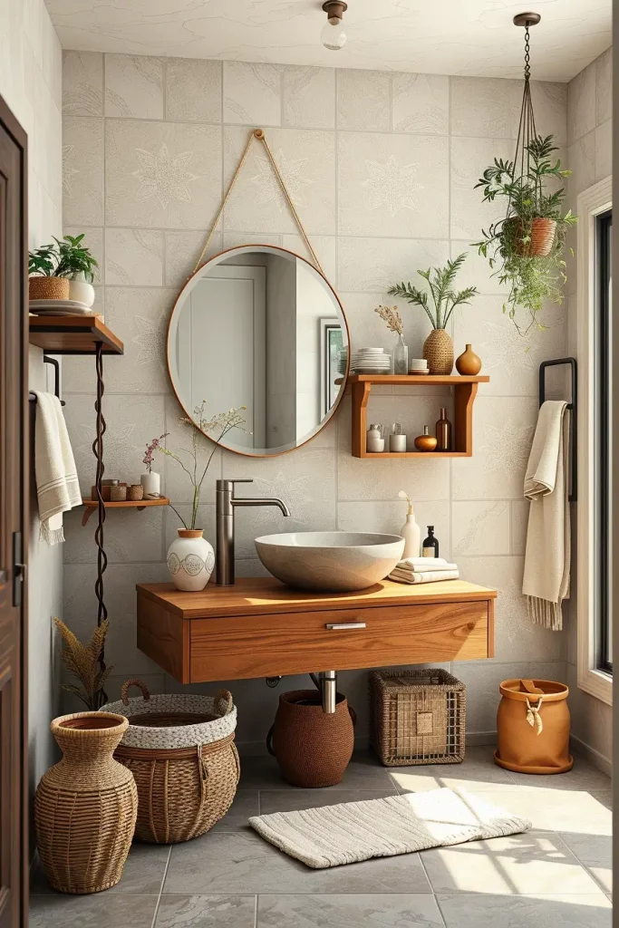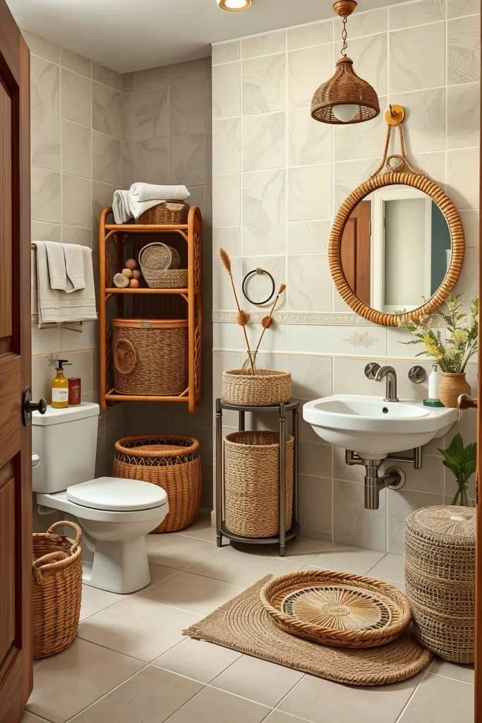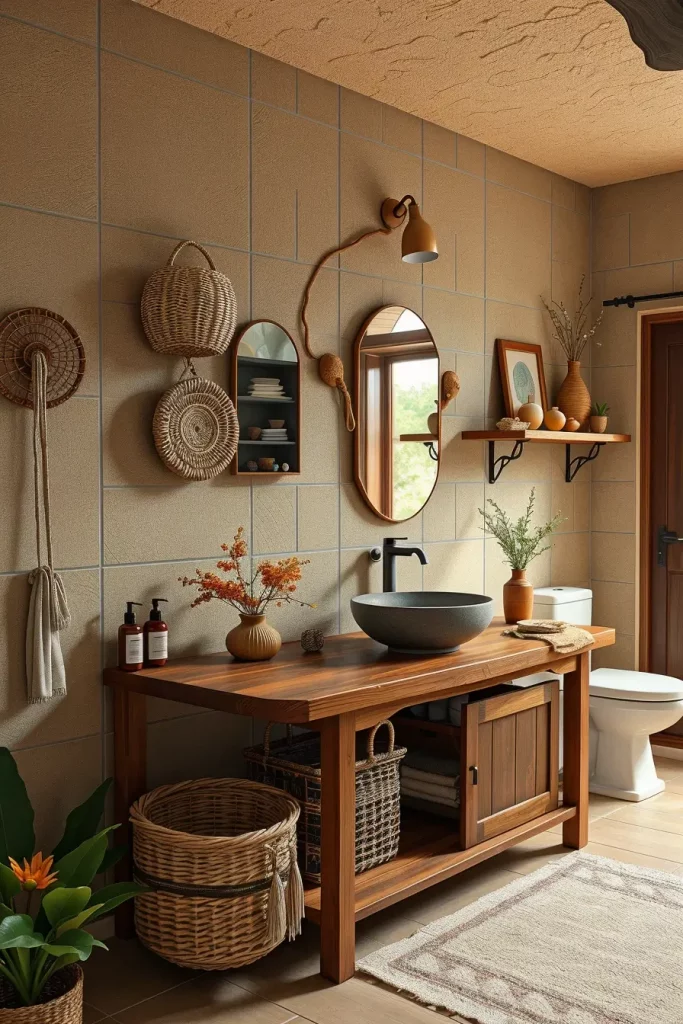 In an earthy bathroom environment, storage capability seldom receives initial design consideration, yet it possesses the potential to become an intentional compositional layer. My preference is to introduce natural-fiber baskets of rattan, jute, and seagrass, whereby each unit fulfils a dual function of concealment and ornamentation. Such interventions assert a consistent organic narrative while discretely harbouring towels, haircare supplies, or reading materials.