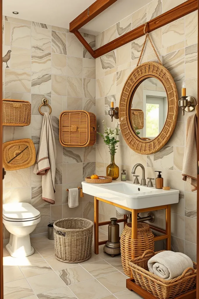 Rattan consistently figures into my bathroom schemes as a lightweight yet resilient natural material that marries functionality with quiet ornamentation. Broader woven accents introduce a refined yet relaxed elegance that counters the sterility of typical hard surfaces.