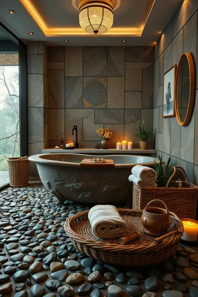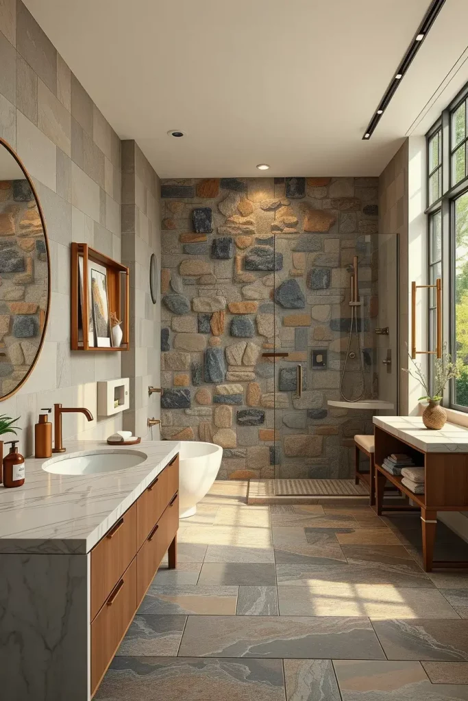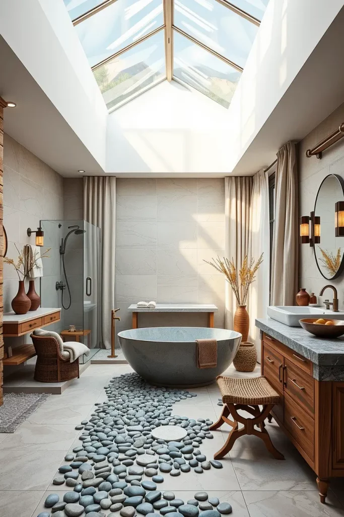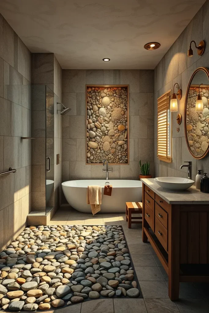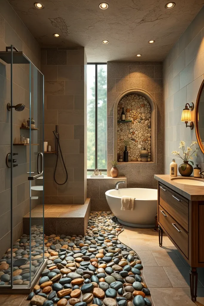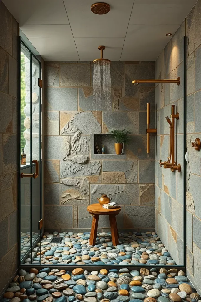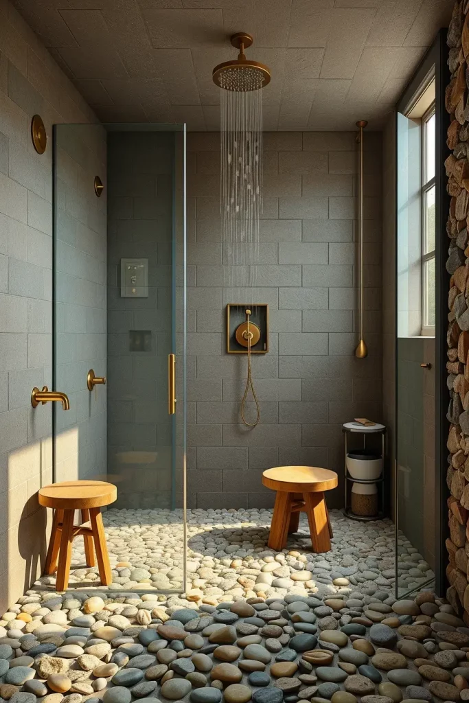 For the flooring, I favor an interlocking pebble mosaic or oversized, thinlay slate, sometimes carried upward onto a painted feature wall to dissolve the boundary between wet and dry. A hemi-stacked wall of the same material allows the mosaic to bubble almost organically across the vertical plane. By framing the shower in a slender, frameless glass panel, the tactile pattern on the floor remains on full display, while the glass itself acts as a modern counterweight to the organic palette. To accent, I usually add reclaimed-wood drop stools, cantilevered stone chai-lung caves, and minimally veined brass fixtures.