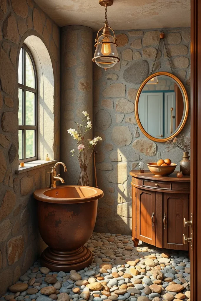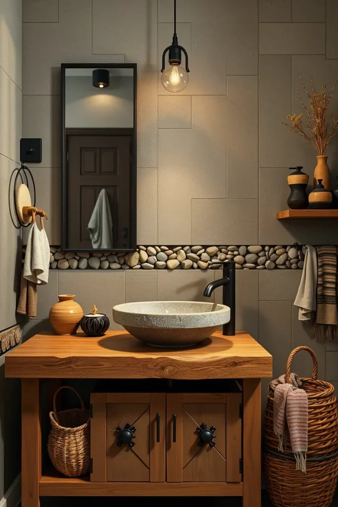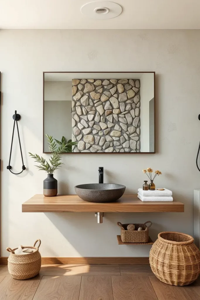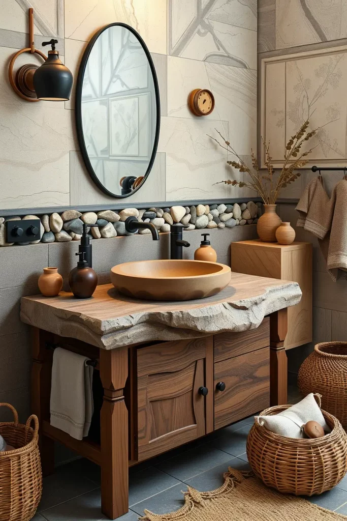 To advance the concept even further, consider the combination of a stone basin with either a pebble floor mat or a narrow backsplash of river rock. This small design gesture anchors the vanity area, allowing the earthy palette to flow consistently throughout the space.