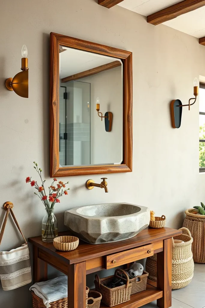 For grounding earthy bathroom designs, a rustic mirror with a wooden frame is a deceptively simple tool. Mirrors are mandatory, yet a piece set within reclaimed timber—bevelled, weathered, or simply rough—elevates them to intentional architecture rather than decorative afterthought. The frame’s grain speaks a softer language than tile or polished porcelain, offering a tactile counterpoint within an oft-sterilised environment.