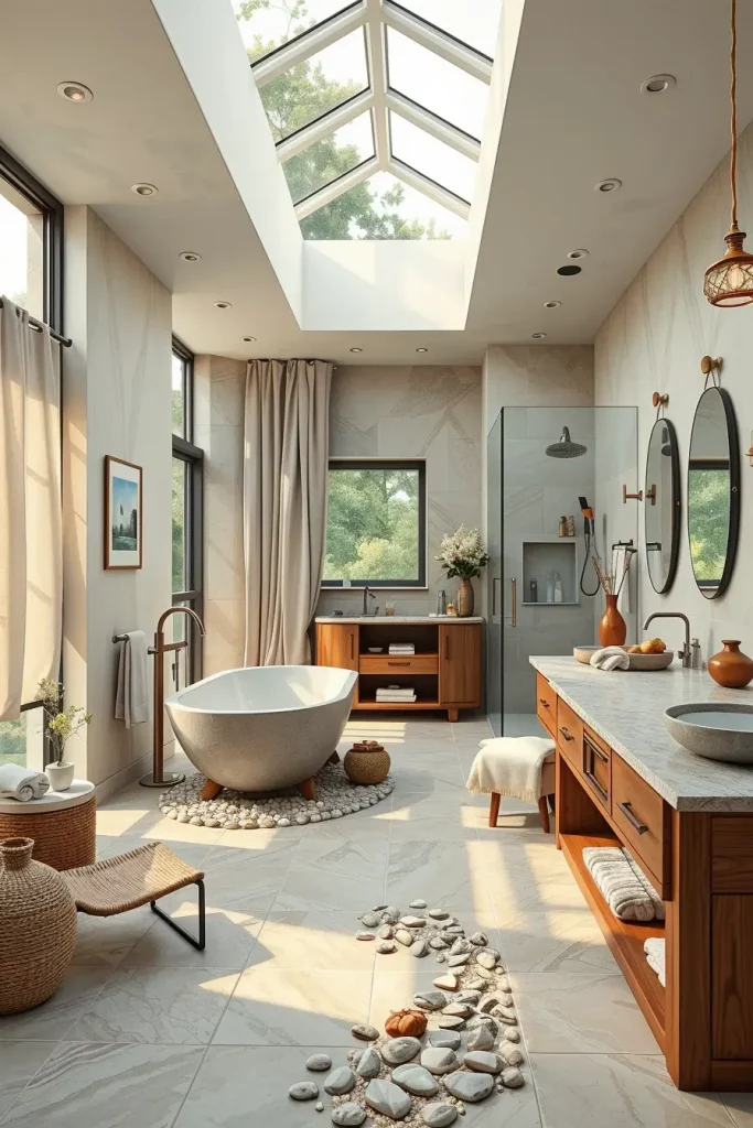 In my own practice, I find that expansive bathrooms require a commanding focal element to ground the space. I am drawn to instances, as seen in Architectural Digest, where diffused daylit skylights or expansive, unobstructed views frame hand-selected stone or cerused wooden detailing, imparting both luxury and a near-meditative calm. I transpose this principle in my designs by strategically introducing daylight and shadow, deliberately layering natural textures to soften the potential harshness of large, reflective surfaces.
