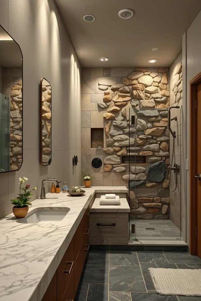 I frequently specify marble for countertops, slate for flooring, and river stone for shower surrounds. Each material unfolds its own narrative—marble speaks refinement, slate imparts geological depth, and river stone introduces a tactile, almost primal resonance. Where stone meets strategically selected wood, the dialogue feels simultaneously opulent and rooted in the land.