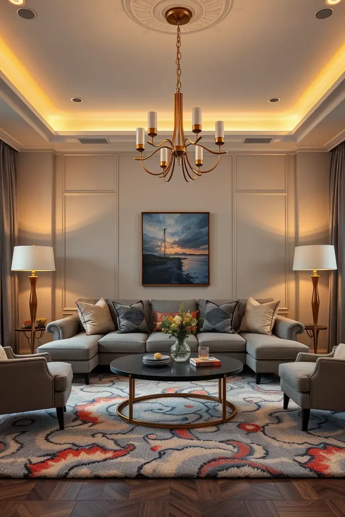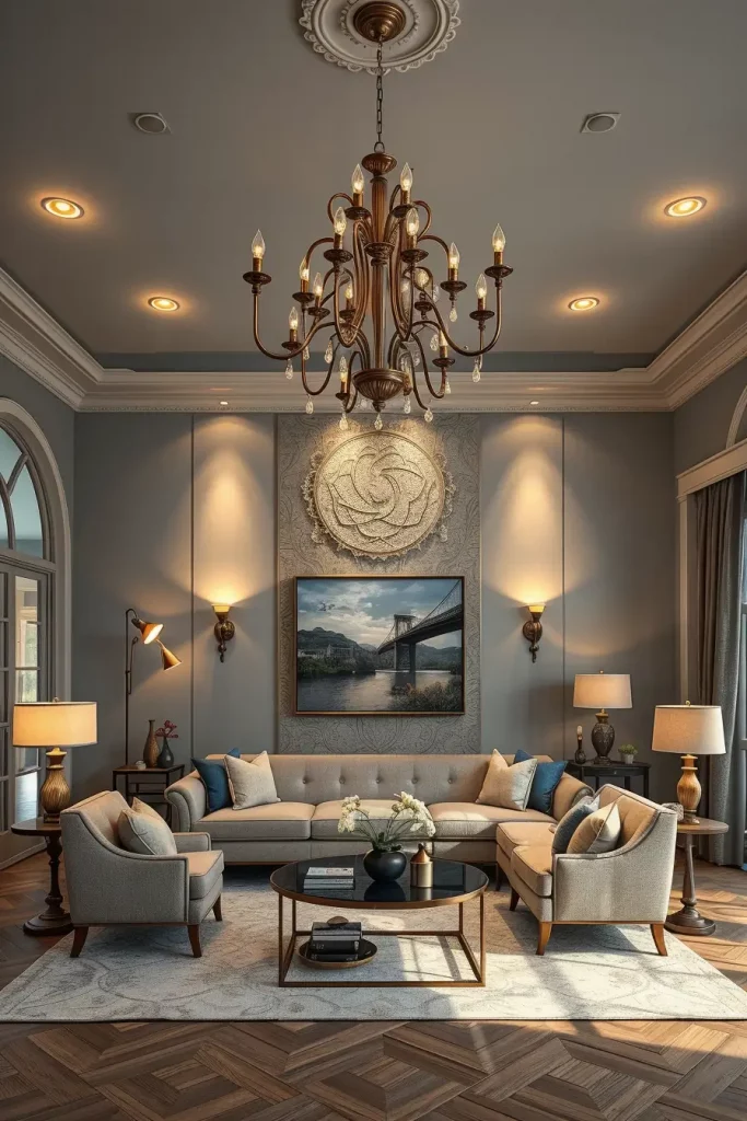 I like brushed gold, matte black or chrome fixtures, which are striking but not so dominant to the color scheme. In one of the projects, I had a cascading crystal chandelier over a plush gray sofa and the result was stunning- it created a soft play of light in the room and made it feel like a luxury lounge.