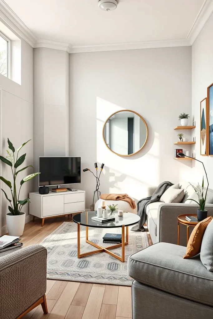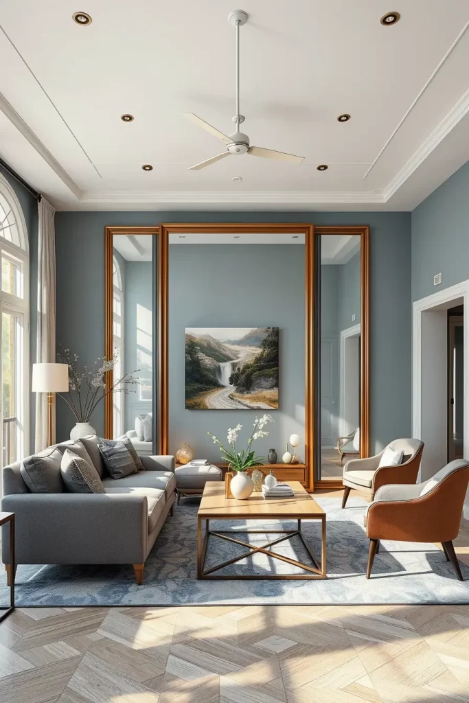 My secret weapon to brightening and enlarging a chic gray living room is mirrors. They reflect light and a small or dark room will appear bigger and brighter. A big mirror facing a window can increase the amount of natural light in a room by twofold, and smaller decorative mirrors can provide sparkle and texture.