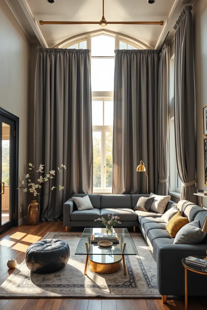The room is framed with curtains that affect the interaction of the light with the gray living room. I tend to go with floor-to-ceiling drapery in textured materials such as linen blends, velvet, or silk. These fabrics hang exquisitely and give an air of luxury.
