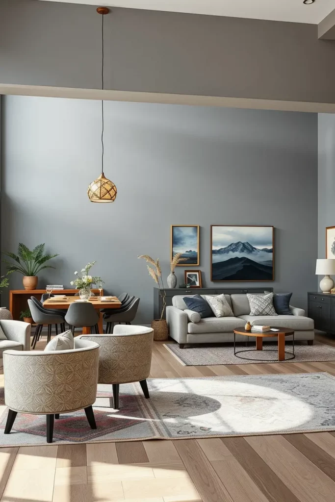 In the case of furniture, I prefer sectional sofas that separate living rooms and dining rooms without obstruction of views. Accent chairs that are coordinated in a shade lighter or darker gray make the palette interesting, and pendant lights above the dining table assist in grounding that space.