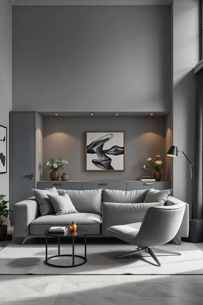 One of the most powerful means of making an elegant gray living room come to life is lighting. Statement fixtures, like chandeliers, sculptural floor lamps, or extra-large pendants, can immediately give personality to a neutral space. I tend to advise warm lighting to offset the coolness of gray and produce a friendly atmosphere. The juxtaposition of smooth gray walls and a striking lighting object attracts the attention to the upper part and gives the impression of careful planning.