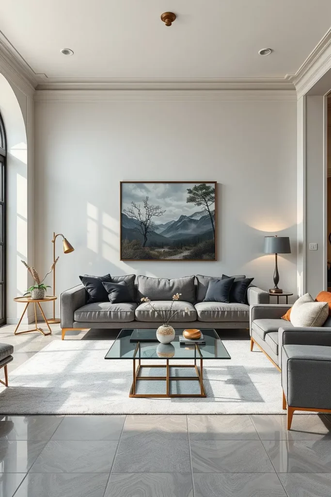 I use simple shapes in furniture choice so that the focus is on the tonal variation. I think glass or metal coffee tables are good here because they do not compete with each other and make the grays shine.