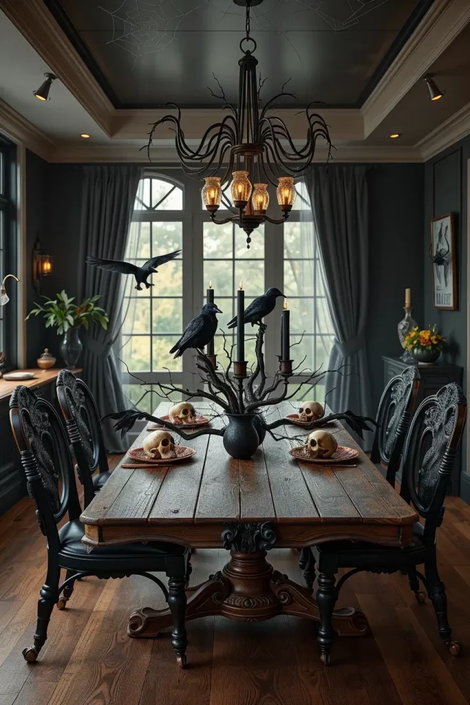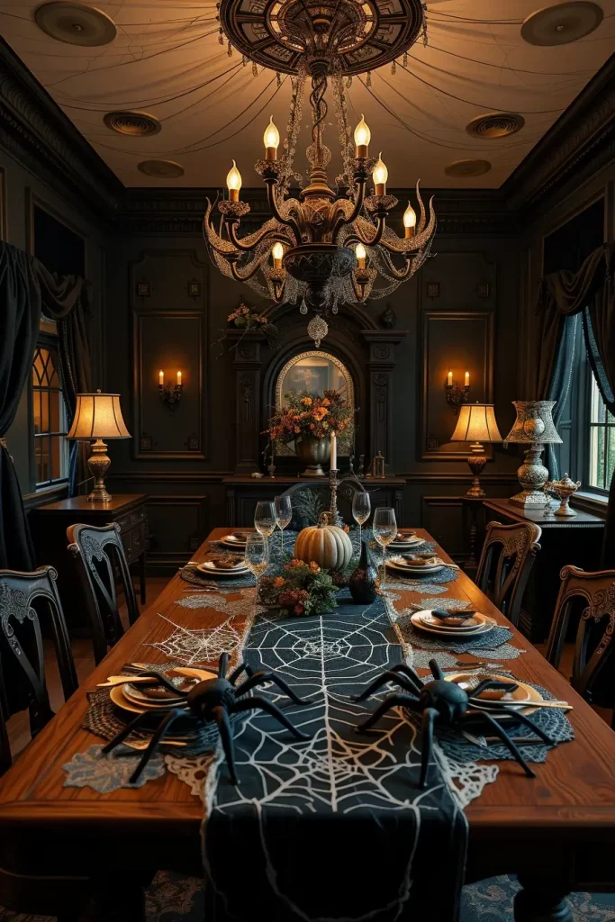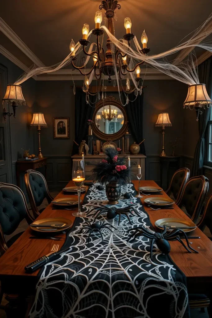 I have always discovered that spider-related decor creates an immediate chilling, but enthralling Halloween mood. To have a 2025-ready interior, I prefer to have a minimal palette black, gray, and silver, and textures that work with light and shadow. The perfect background is a large dining room with gloomy walls, low light, and wooden decor. By covering the table with webbing material, the focus is not only drawn in but also the room is visually connected.