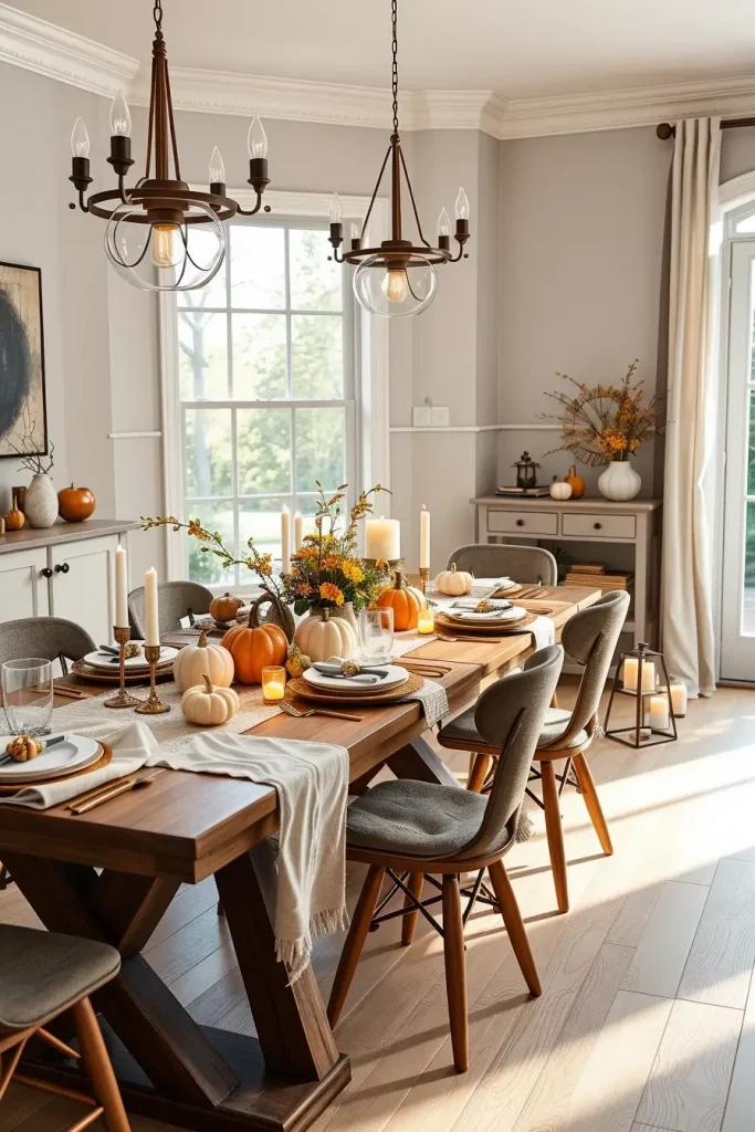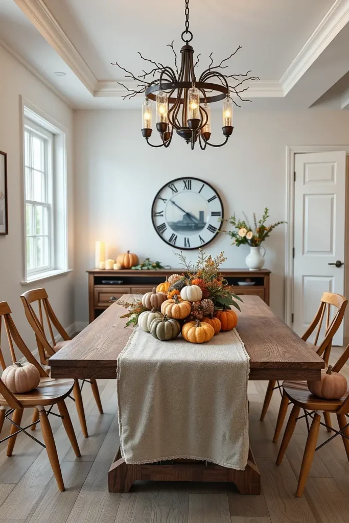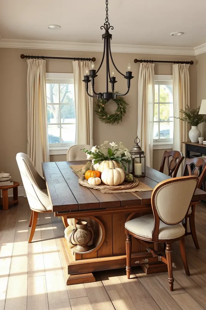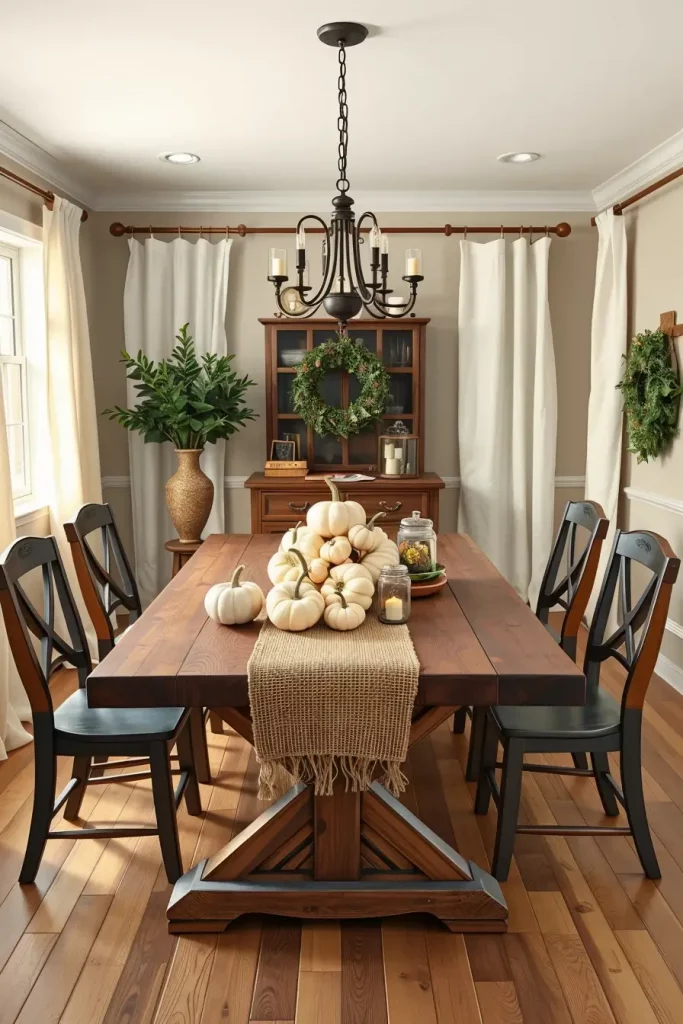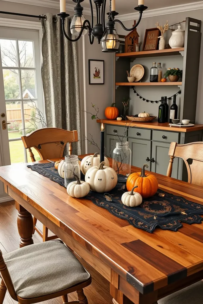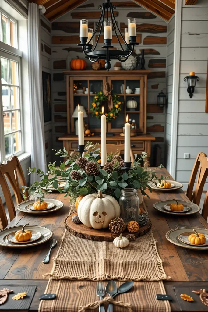 In case your house is more rustic or neutral, farmhouse Halloween centerpieces are the best thing to do, particularly using white pumpkins as the center of attention. I tend to go with a reclaimed wood table as the foundation, cream linens, and soft beige walls so that the room does not feel dark and gloomy as the spooky elements are introduced.