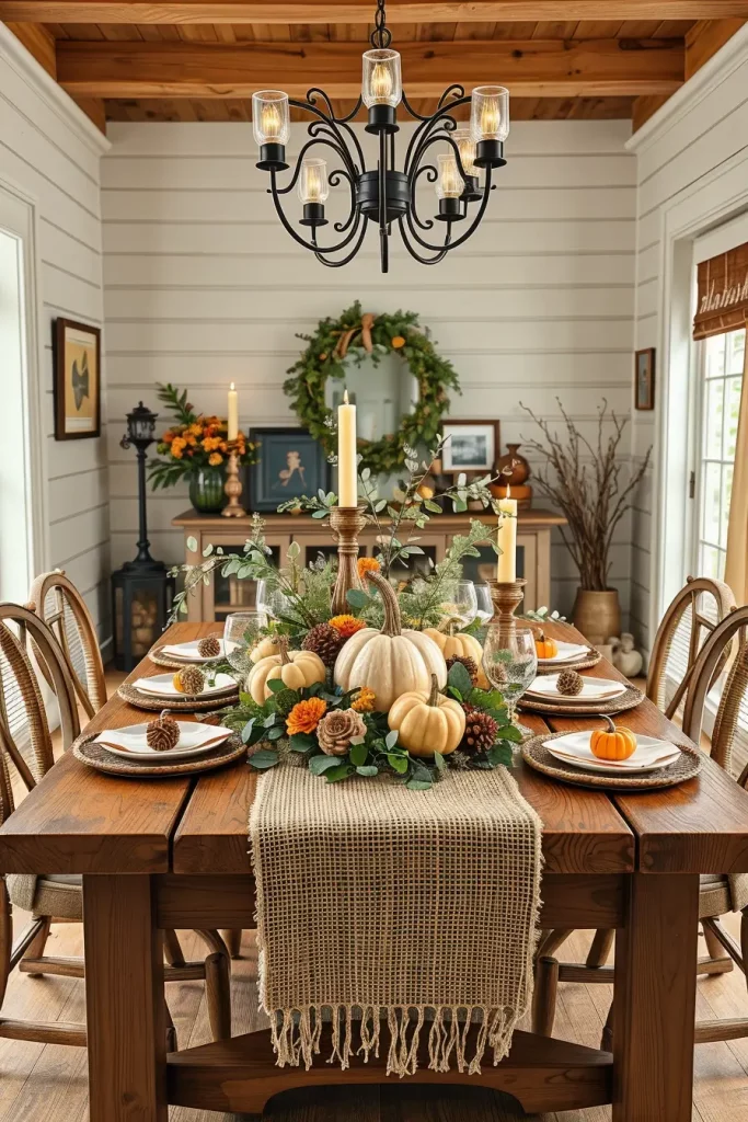 To achieve a cozy farmhouse Halloween look, I would always prefer rustic styling. Imagine a dining room that has shiplap walls, distressed white cabinets, a raw wood table, and iron pendant lights. The most important thing is natural textures burlap runners, linen napkins, wooden crates or baskets.