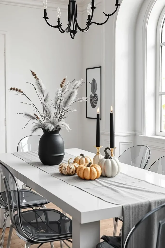 Halloween decor must be minimal when it comes to minimalist interiors: sleek, purposeful, and clutter-free. My favorite dining room design is clean lines, neutral walls, natural light, and minimalist furniture such as white or gray dining tables, acrylic chairs, and matte black fixtures. The concept is to have one or two daring pieces to shine through instead of filling the room with themed junk.