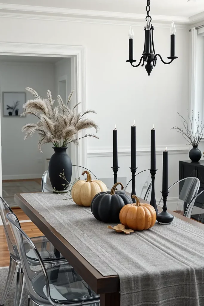 To make a contemporary centerpiece, I would suggest one geometric vase filled with jet-black pampas grass or white-painted twigs, and surrounded by black matte candleholders with tall tapers. Add concrete pumpkins or ceramic ghost sculptures of dull colors. The composition is anchored by a beige or dark charcoal linen runner, which does not overwhelm the appearance. Stick to black, white, gray, and one accent color such as burnt orange.