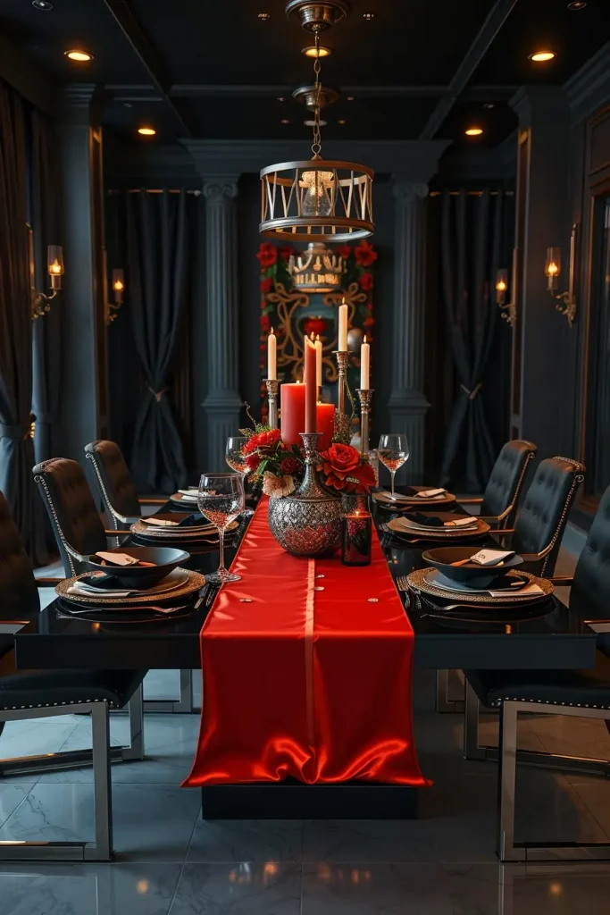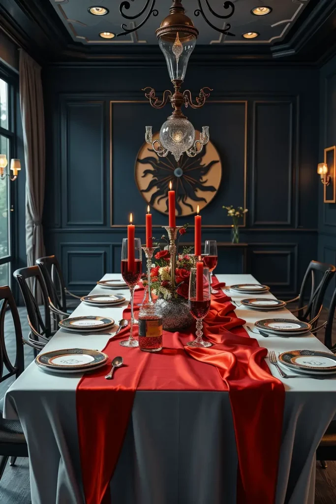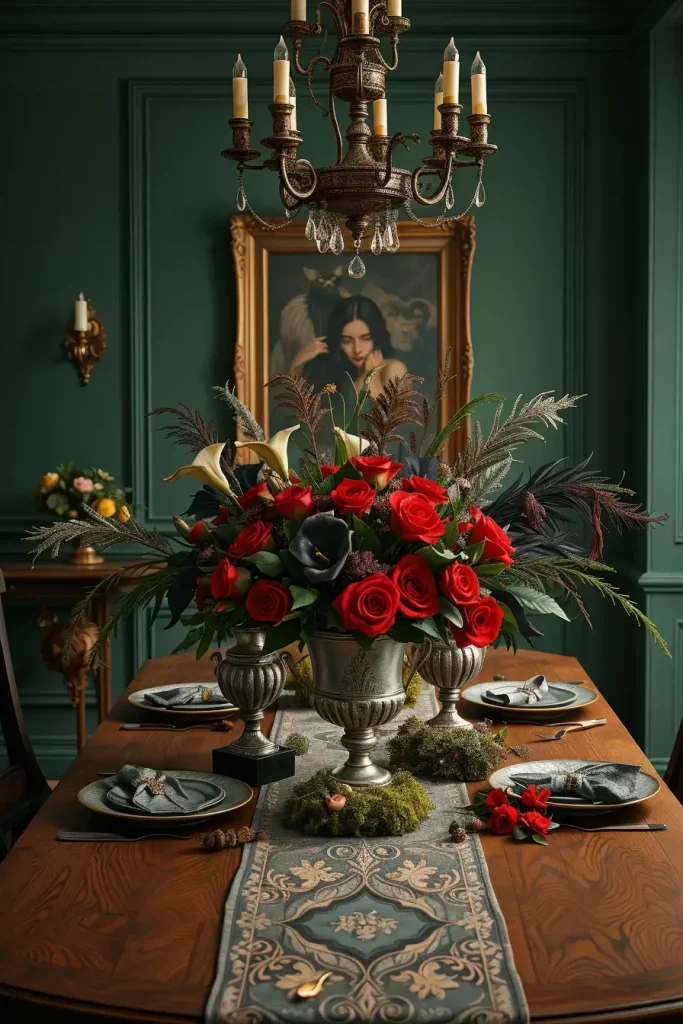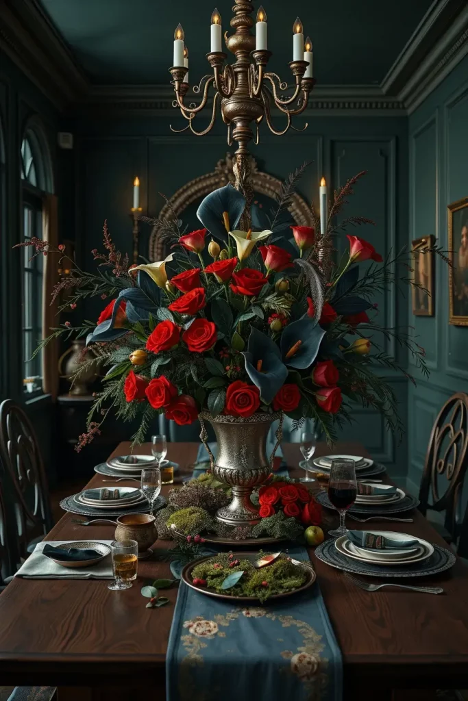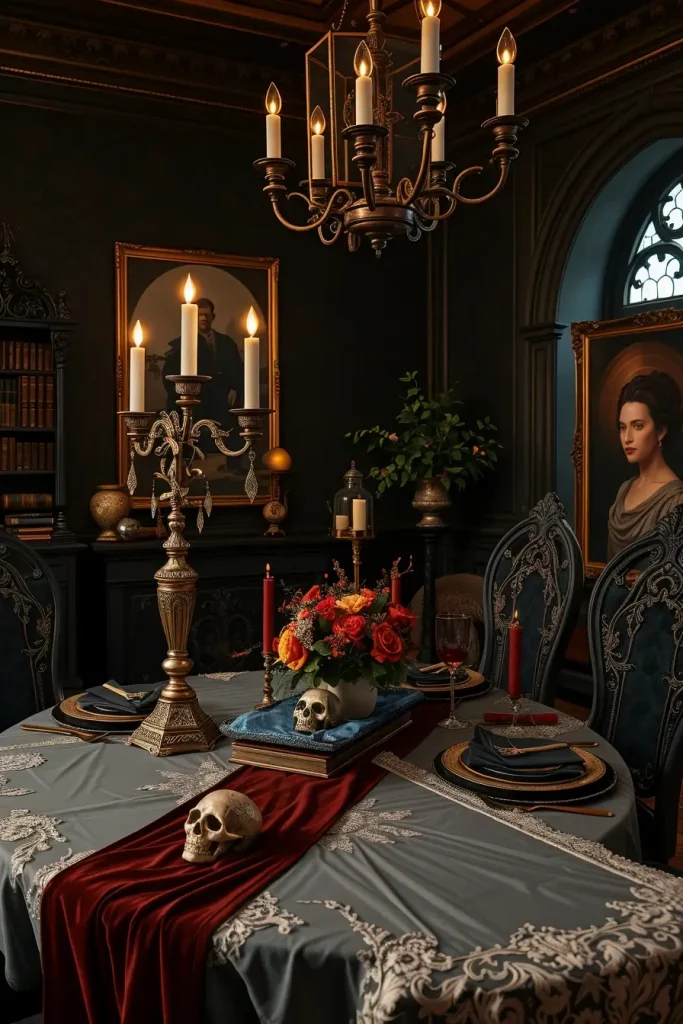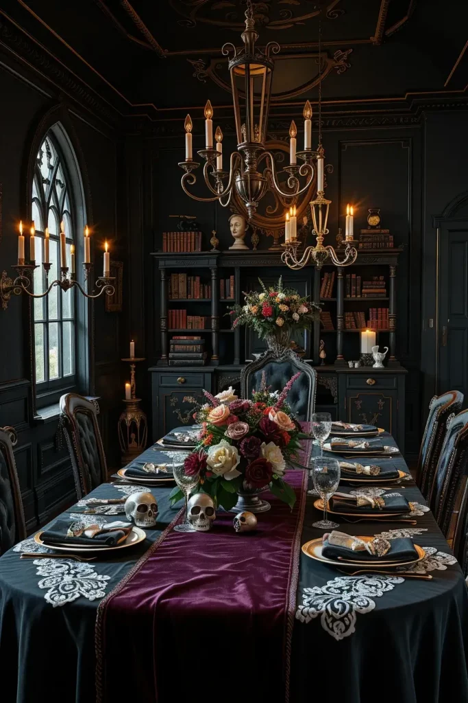 Candlelight should be the main element. Tall, fancy candelabras with dripping black or red candles, surrounded by old books, miniature silver skulls, and dark flowers such as dahlias or peonies. The scene is elevated by velvet table runners and lace overlays. Gothic accessories such as black crystal goblets and silver cutlery are used to complete the gothic look.