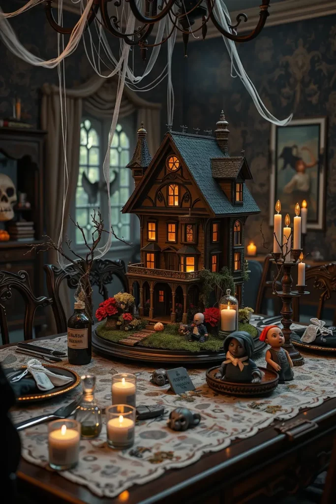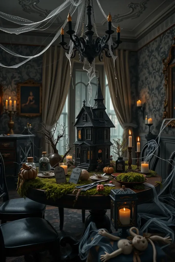 The haunted house theme is one of the most immersive centerpiece ideas that I employ- it immediately builds a story. I tend to create such arrangements in the rooms with dark wood floors, old sideboards, and heavy curtains to regulate lighting. Provide a creepy mood by using candles or string lights that flicker and sound effects like creaking doors or the sound of ghosts.