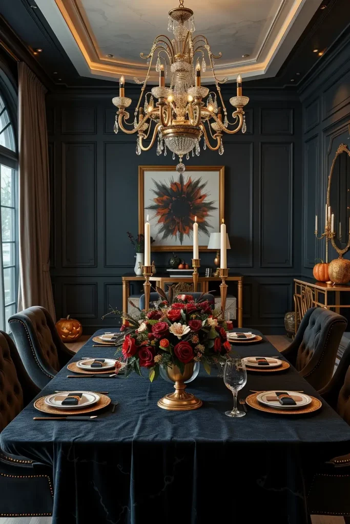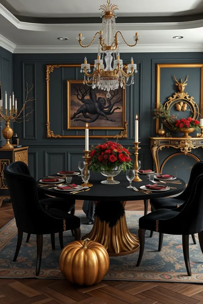 Classy does not imply dull–not when it comes to black and gold Halloween centerpieces, anyway. The combination is modern, sleek, and impressively versatile in 2025. I like to apply this theme in dining rooms that have high ceilings, glass chandeliers, and black wood or high gloss lacquer dining tables.