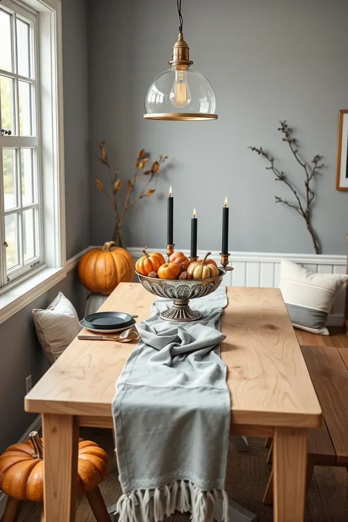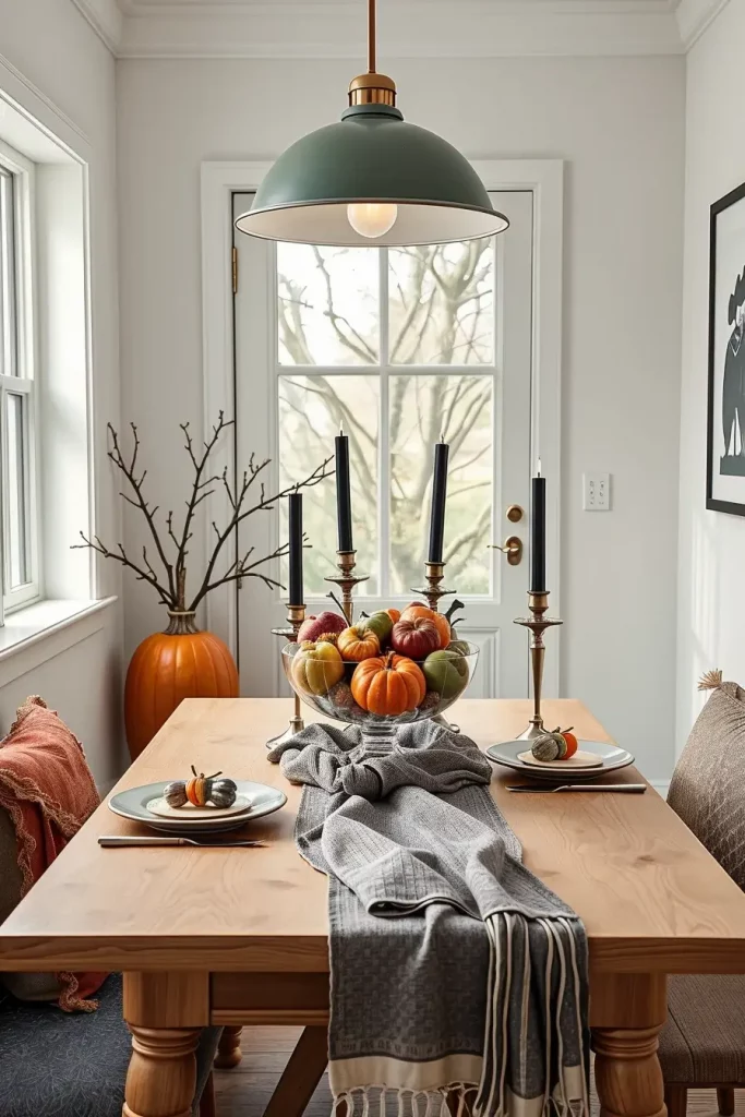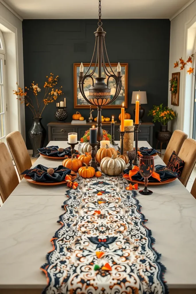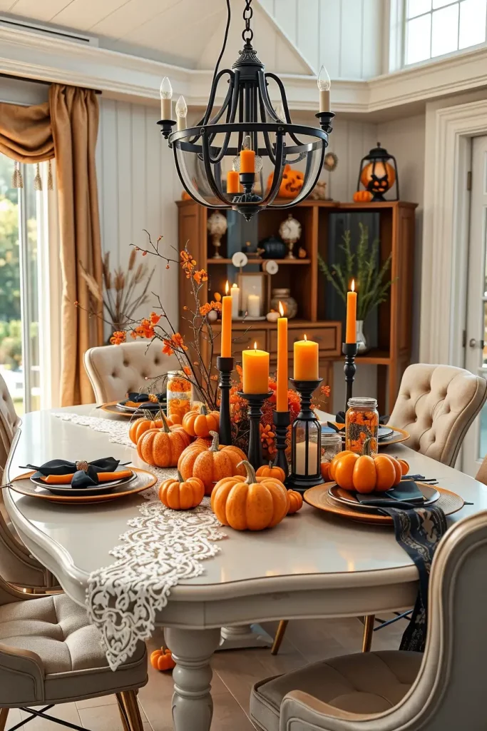 A pumpkin-themed table can fit nearly any Halloween style, whether it is whimsical or traditional. I prefer to use a neutral room as a background-maybe off-white or soft grey walls, a natural wood table, and layered linens. This causes the orange colors to stand out without being in conflict. The warm light of pendant lights or candles may add to the seasonal, comfortable atmosphere.