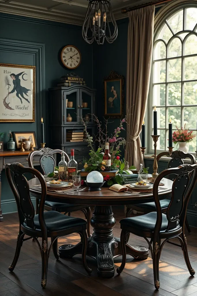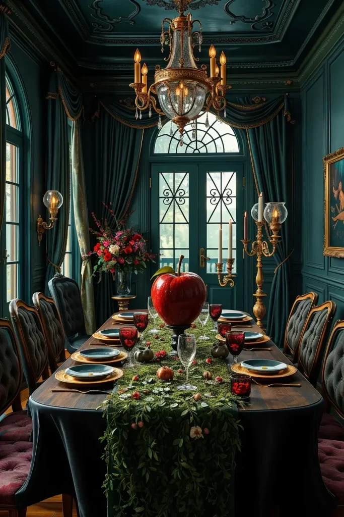 Every apple is placed on an antique dish or black lace doily and I frequently add hand-written potion labels to give a fairy-tale effect. Putting glass orbs with miniature LED lights above the table makes it appear to be floating and mystical. The dark-stained dining table will add to the atmosphere, particularly when the room has velvet upholstered chairs or jewel-toned accent pieces.