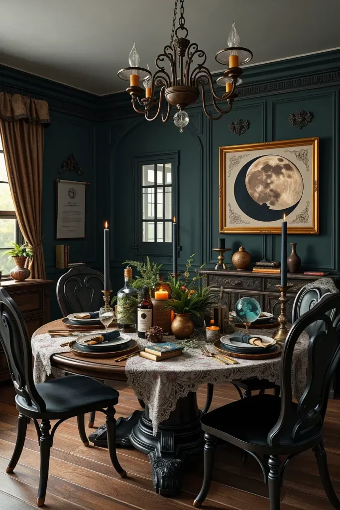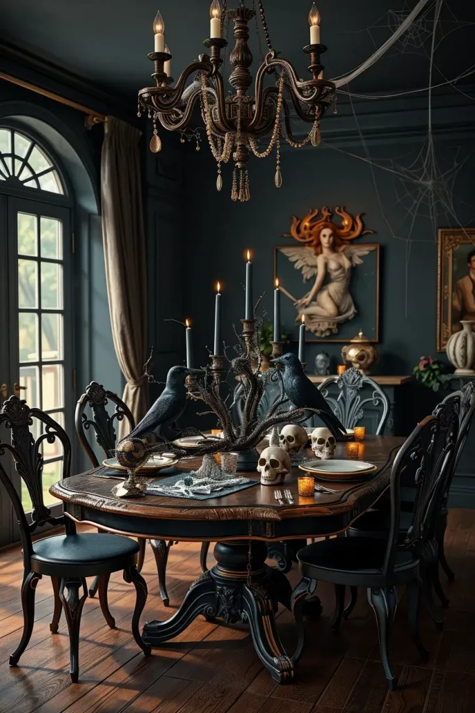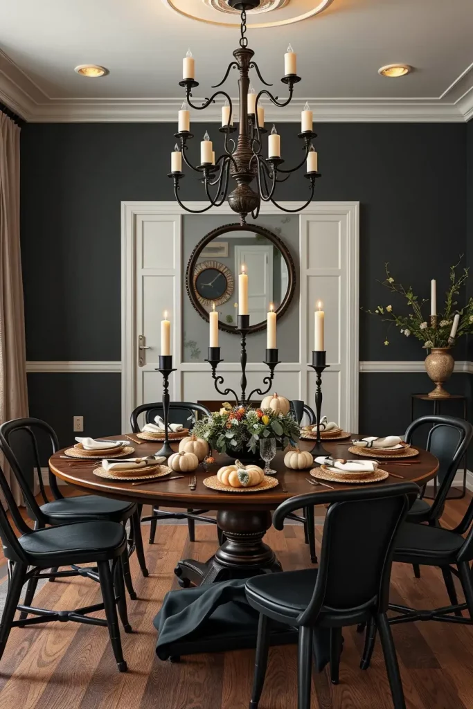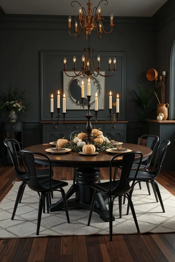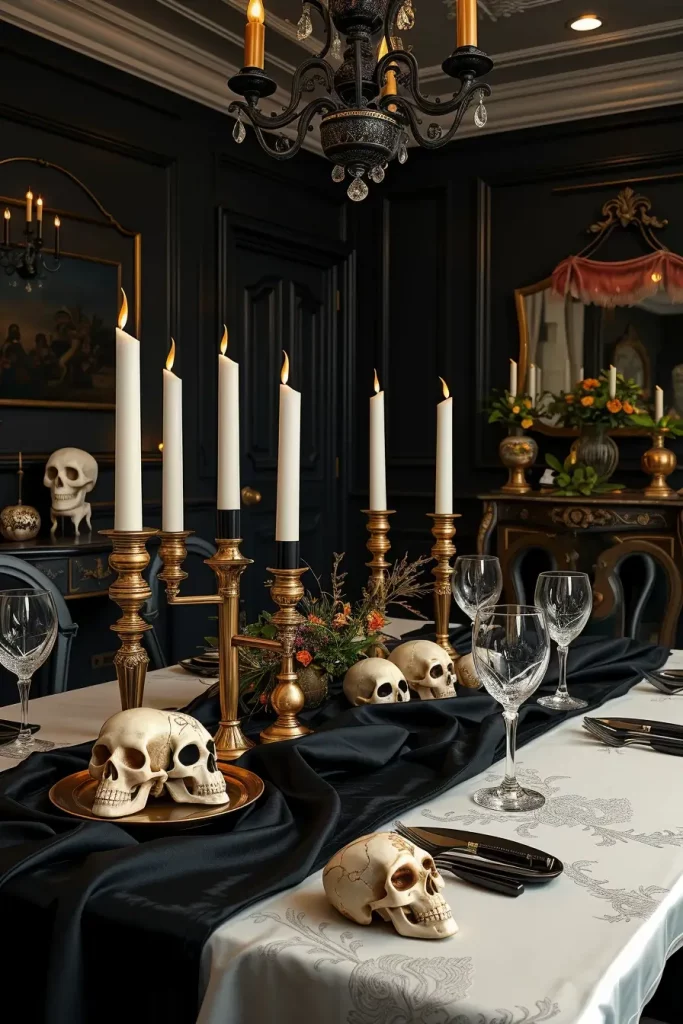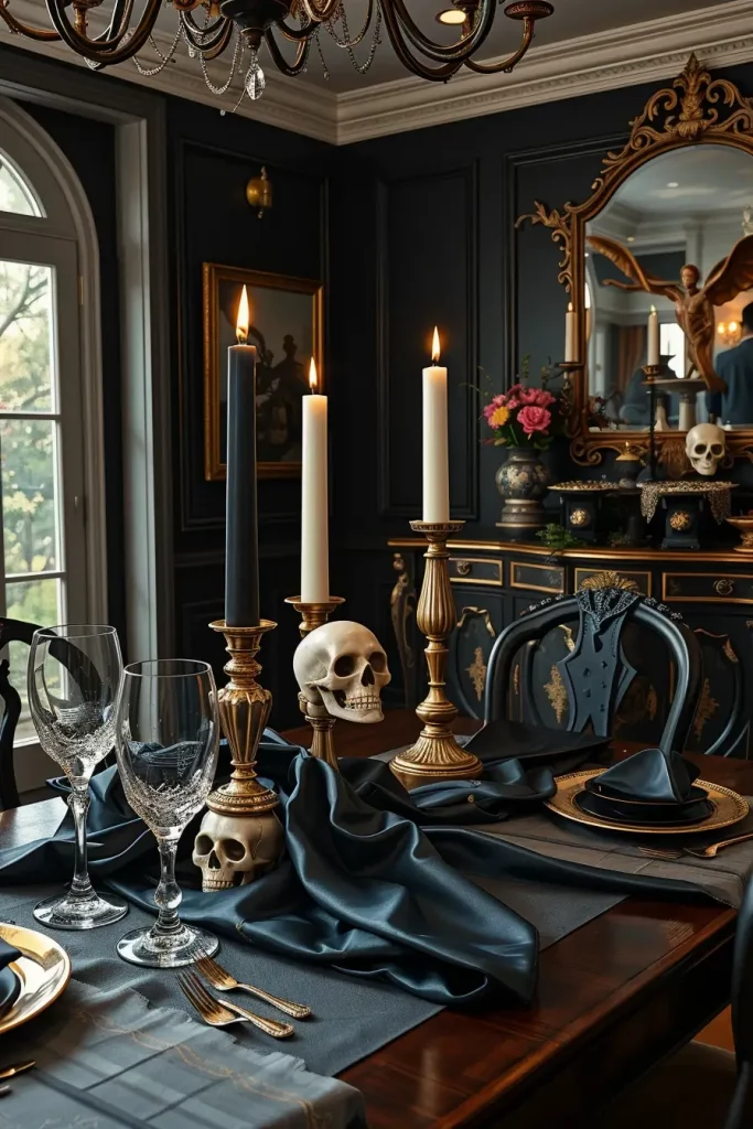 The black candle and skull combination is the most classic Halloween thing. In 2025, I’m seeing this trend evolve into something more elegant and structured. To anchor the look, I will always start with a black satin or faux leather table runner. A dark-painted dining room with high-gloss or matte-black wainscoting amps up the drama without making the room look like a movie set.