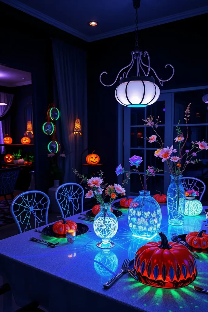 Make a glowing centerpiece with neon painted pumpkins, glow sticks in clear vases and phosphorescent spiderwebs. Add glowing glass beads, fiber optic flowers or acrylic shapes of ghosts that glow under UV. The tableware should be clear or black so that the light effects can be seen and incorporate LED strips around the table edge.