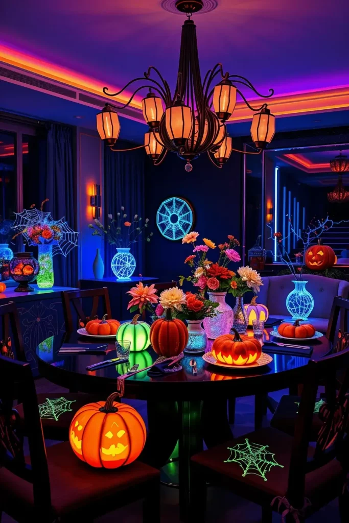 Halloween is a glowing, futuristic and playful holiday. I have noticed this to be particularly useful in restaurants with dim lighting, white walls, or minimalist interiors. The trick is to have UV-reactive materials and blacklights positioned over the table or over the heads.