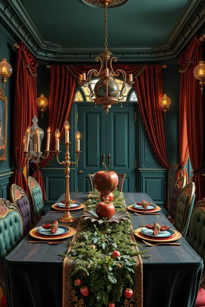 A poison apple Halloween table is one of the most enchanting concepts of 2025. This style flourishes in glamorous, magical environments- imagine dark emerald green walls, deep velvet curtains and furniture with gold accents. I typically style the table with moss runners, glistening red apples dipped in black caramel (real or faux), and tall gold candelabras.