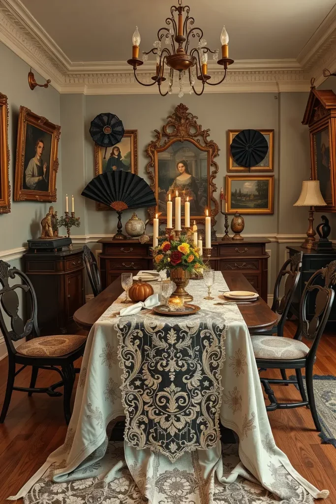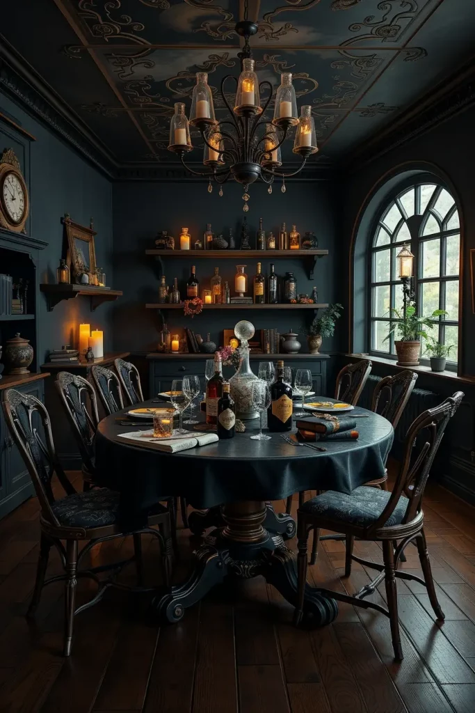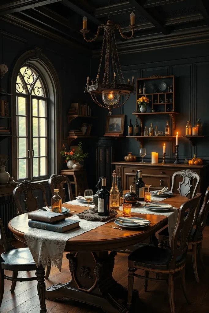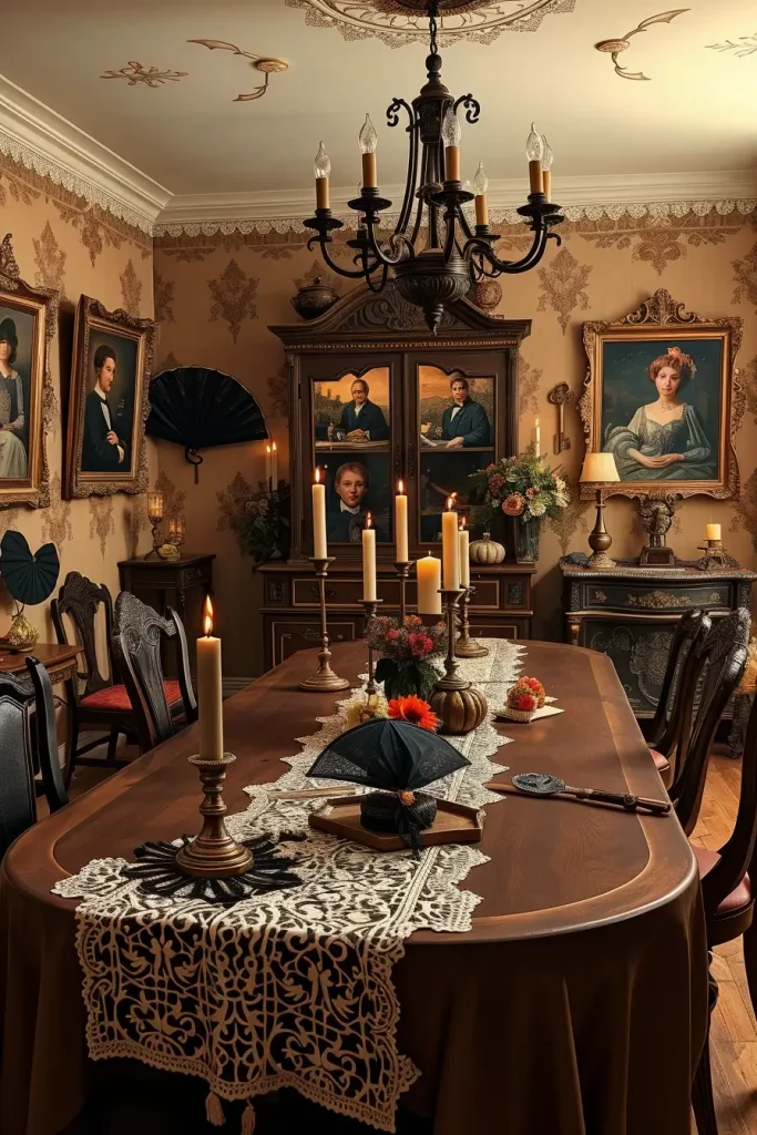 To take this theme even further I would recommend actual antique candelabras or Edison bulb lanterns. Dim lighting and subtle background music (like phonograph-style jazz or eerie piano) can make the entire room feel like it’s stepped out of time.