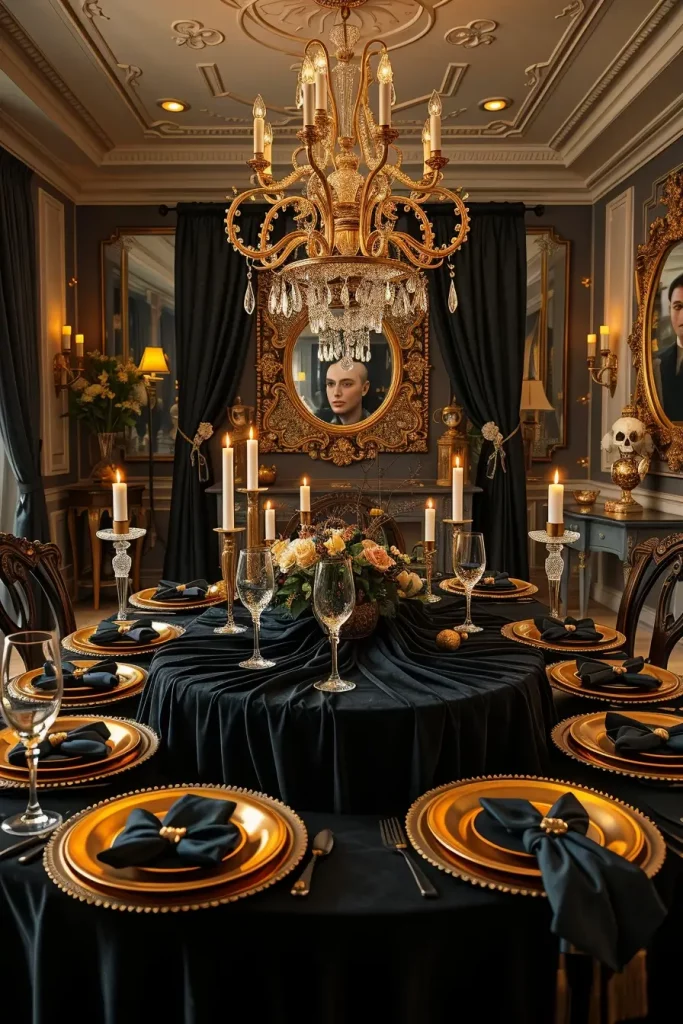 To complete this setup, I’d recommend incorporating elegant place cards with gold calligraphy, fine china with subtle Halloween motifs (like spiderweb lace patterns), and velvet napkins for a final touch of opulence.