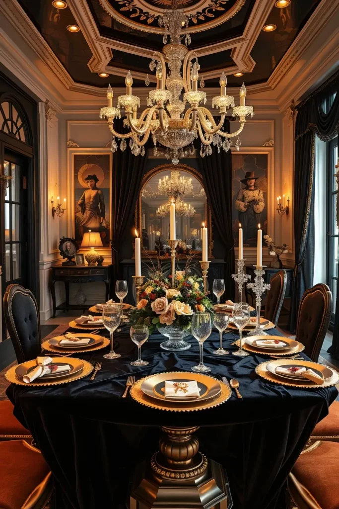 To those of us who would prefer Halloween without the camp, a sophisticated Halloween dining table set up provides the ideal compromise. I have created atmospheres in which dark glamor is the main topic: black table cloths, gold-rimmed glassware, and elegant floral decorations in deep colors such as burgundy and plum. There is a crystal chandelier hanging above and velvet upholstery on the chairs which makes it rich.