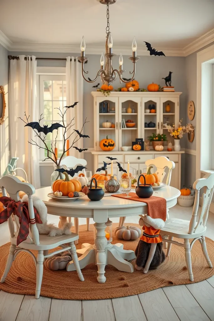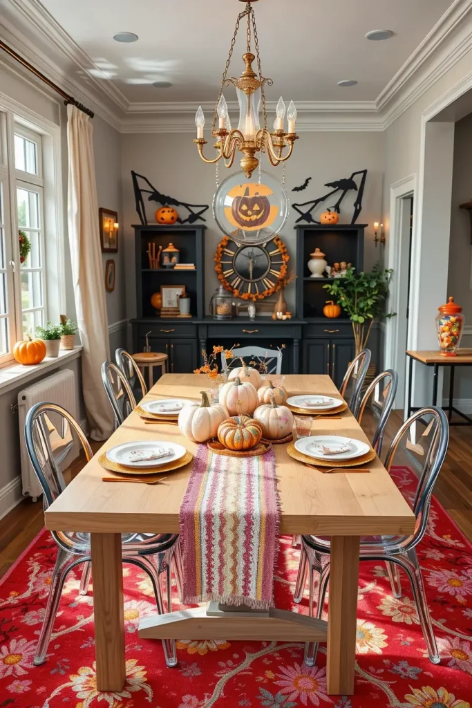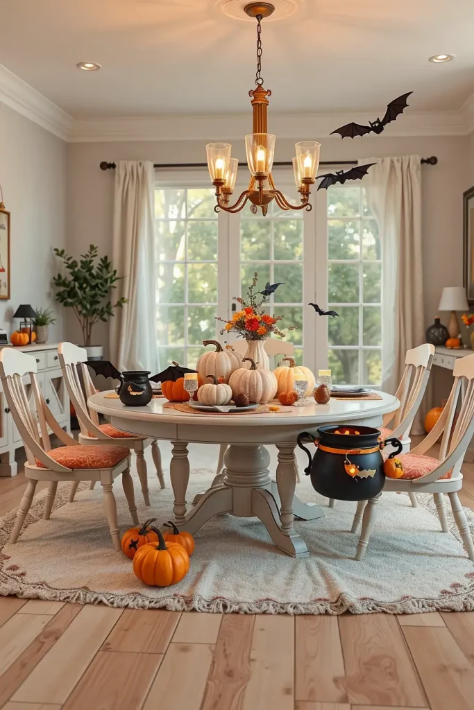 As far as Halloween decor that is family-oriented, I think that a combination of charm and whimsy with usability is the way to go. Dining rooms in homes with children are frequently multipurpose-crafts, snacks, and family meals-and the room must be kept friendly and secure. The best interior here would be a bright, jovial interior with much natural light, soft furnishings, and pastel or muted Halloween colors. I tend to prefer light wood furniture, washable tablecloths and soft rug textures on the floor.